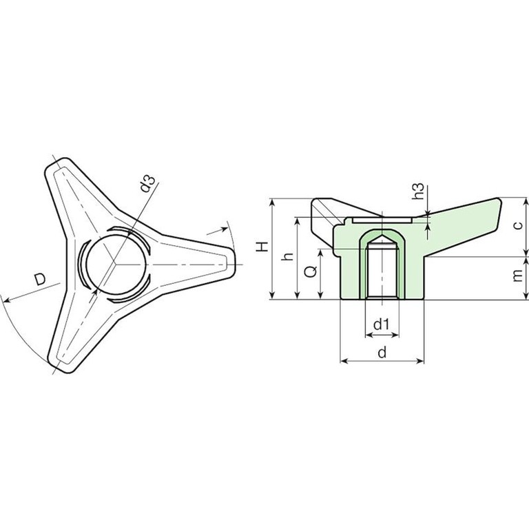 | Kode | art. | D | H | h | d | c | m | d3 | h3 | d1 6H | Q | Weight (g) |