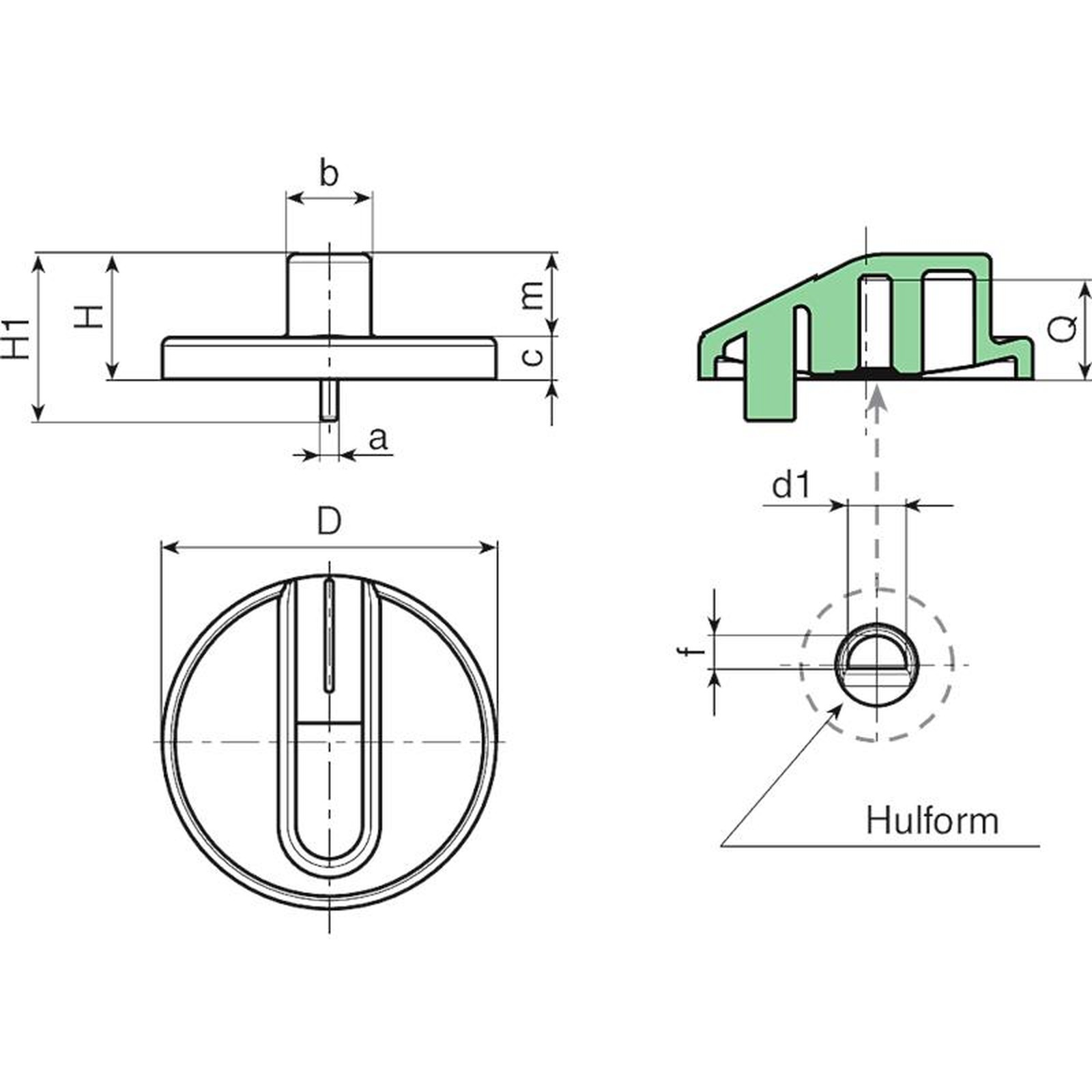 | Kode | art. | D | H | H1 | a | b | c | m | f | d1 | Q | Weight (g) |
