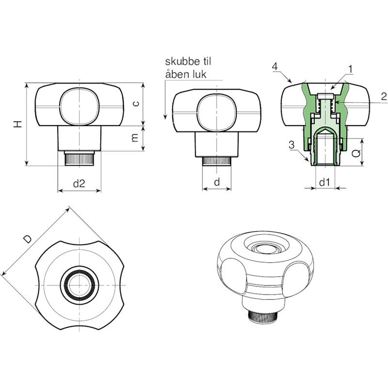 | Kode | art. | D | H | d2 | d | m | c | d1 6H | Q | Weight (g) |