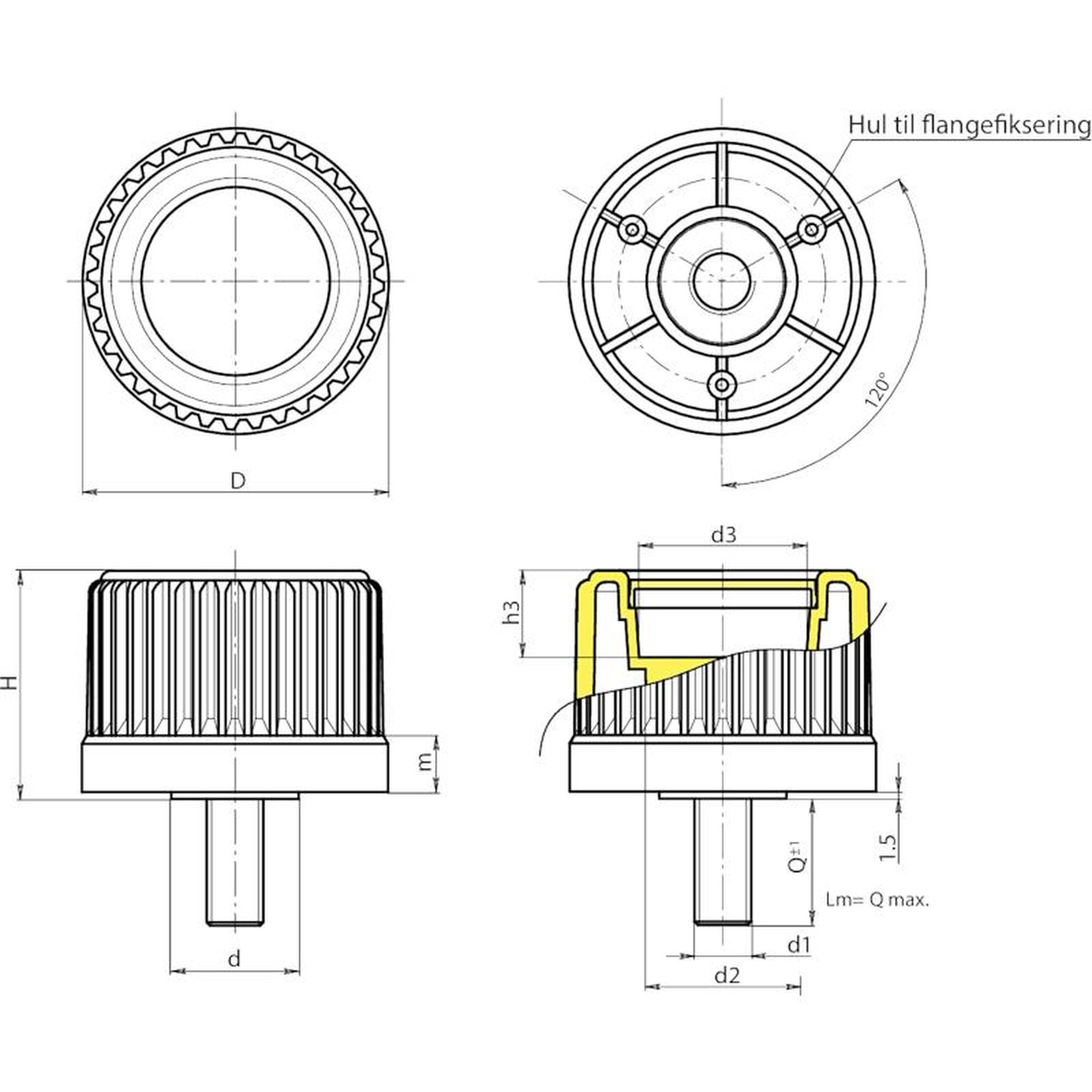 | Kode | Art. | D | H | m | d | d2 | d3 | h3 | LM | d1 6g | Q | Weight (g) |