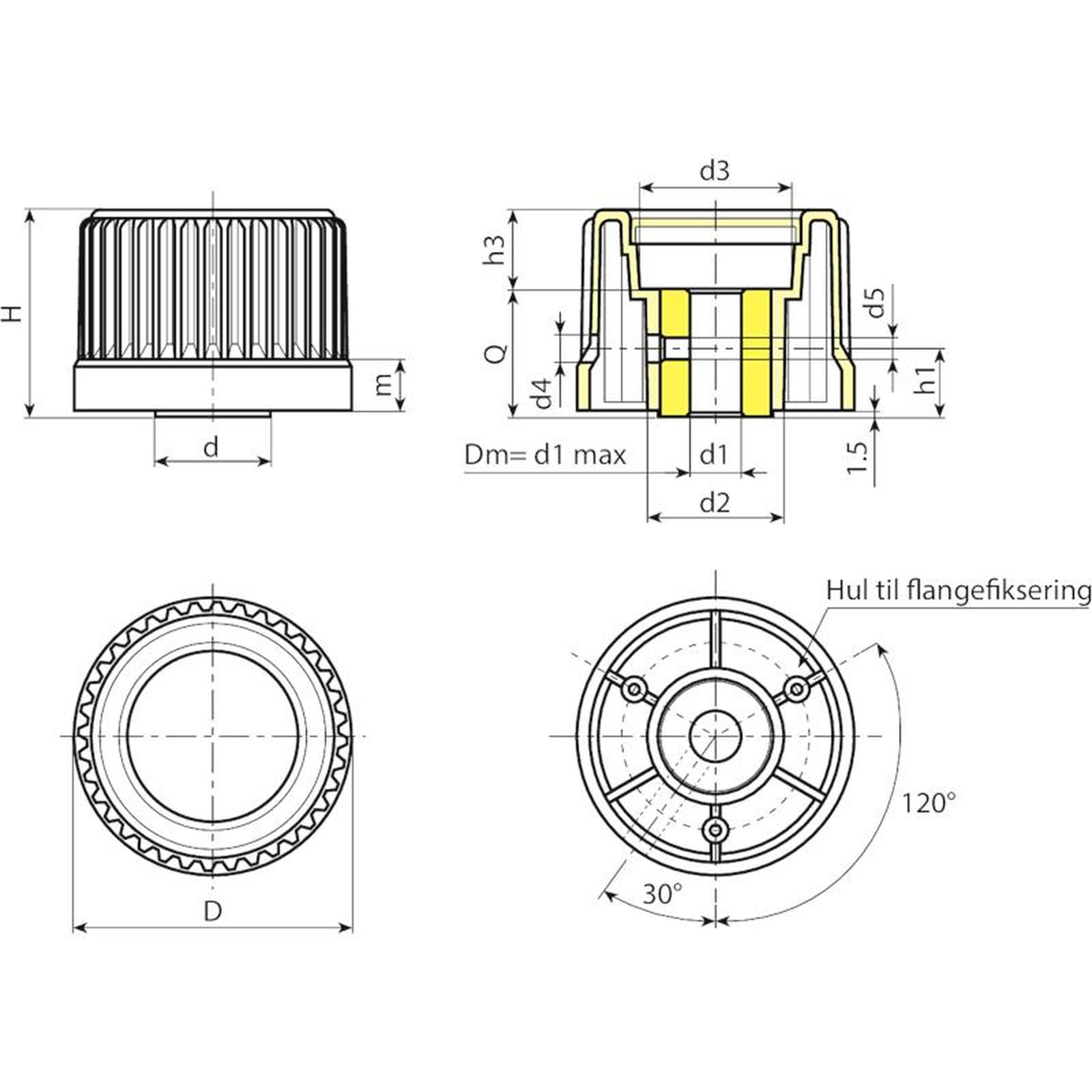 | Kode | Art. | D | H | m | d | d2 | d3 | d4 | d5 | h1 | h3 | Dm | d1 H10 | Q | Weight (g) |