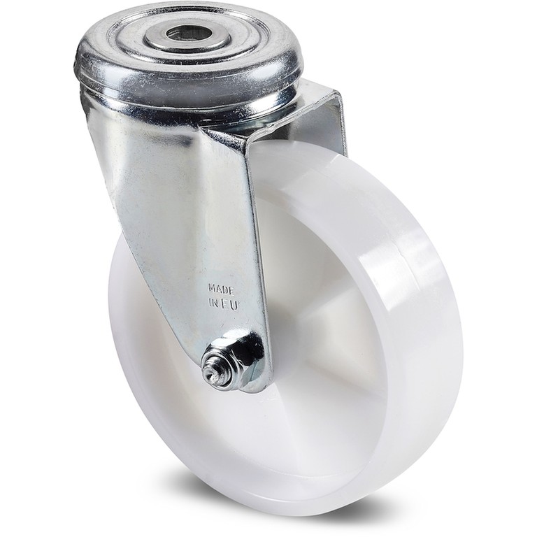 MONOLITISK HJUL AF POLYAMID MED RUND DREJELIG STØTTE AF STÅL OG GLAT GENNEMGÅENDE HUL