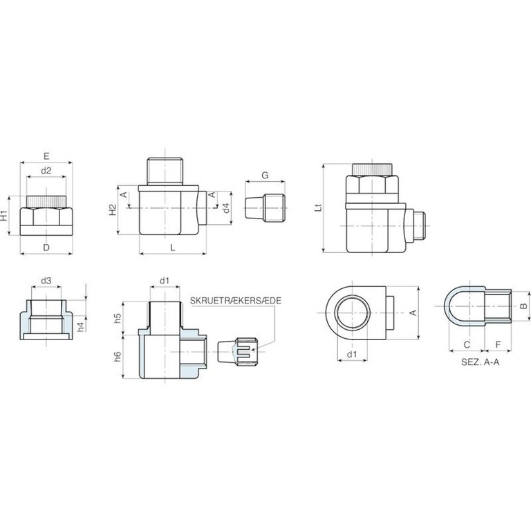 | Kode | art. | B | C | D | E | F | G | L | H1 | H2 | h4 | h5 | h6 | d1 | d2 | d3 | d4 | Lt | Weight (g) |
