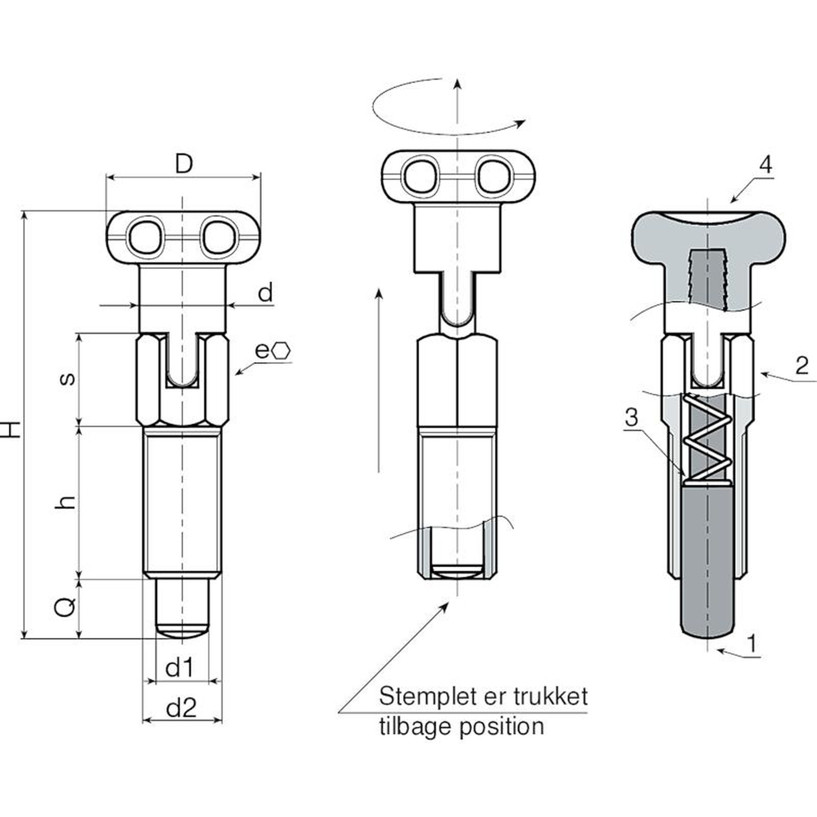 (2) Gevindskåret positioneringsboltkorpus med blokering, af rustfrit stål (AISI 303).
