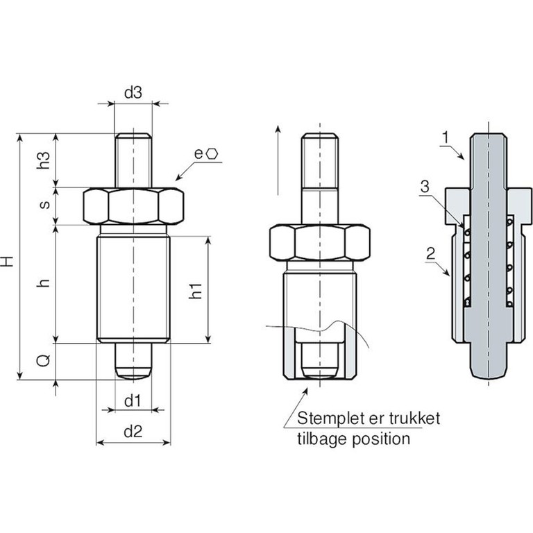 | Kode | Art. | H | h | h1 | d2 | d3 | h3 | e | s | d1 -0,02 -0,04 | Q | Weight (g) |