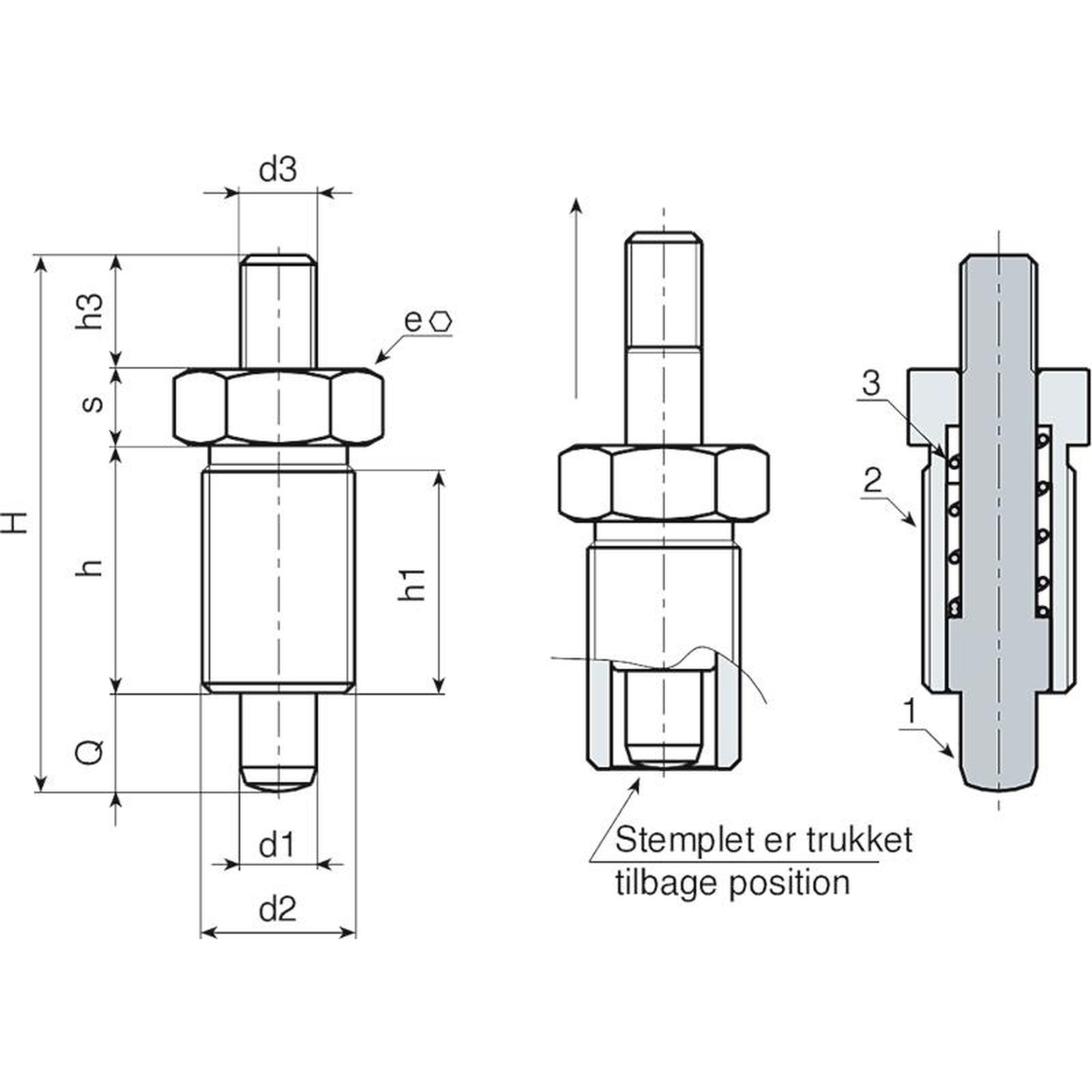 | Kode | Art. | H | h | h1 | d2 | d3 | h3 | e | s | d1 -0,02 -0,04 | Q | Weight (g) |