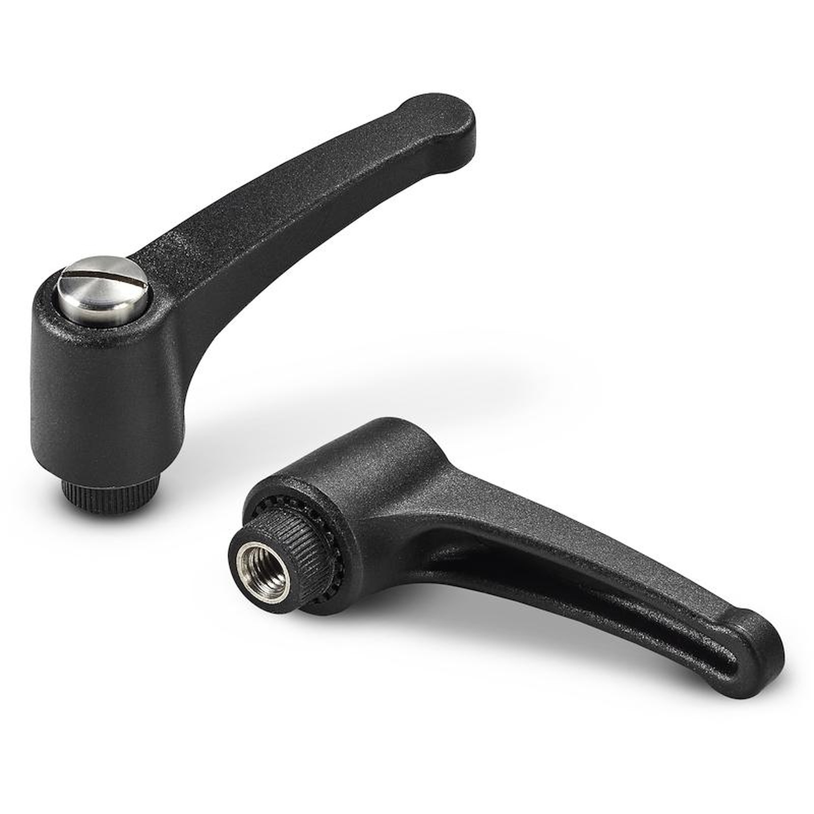 Die Standardausführung unseres Katalogs sieht einen Rastenhebel mit Schraube und Innengewinde vor und hebt sich somit vom kostengünstigeren Hebel (A582) mit Knopfbefestigung ab. Solidität und Schließfestigkeit bleiben für die ganze Serie gleich. Die Befestigungsschraube bietet zwei wichtige Vorteile: die Möglichkeit, den Hebel mit einem auf die Schraube einwirkenden Schrauber anzuschrauben und, falls der Hebel bei der Montage nicht um 360° drehbar ist, die Schraube zu lösen und somit den Hebel abzunehmen, damit er anschließend auf der Endanwendung richtig positioniert wieder festgespannt werden kann. Der verstellbare Griff ist dank der Form und der Möglichkeit, den Griffkörper anzuheben und in einem anderen Winkel zu positionieren, auch unter beengten Platzverhältnissen einsetzbar, wenn eine komplette Drehung nicht möglich ist. Dies gilt z. B. bei Werkzeugmaschinen, Maschinen für die Holzverarbeitung und Verpackung oder allen anderen Ausrüstungen oder Anlagen. Der Hebel eignet sich besonders für die Branchen Industriebeleuchtung und Profi-Fitness (Fitnessgeräte und Fahrräder). Der Rastenhebel A580 ist aus hochfestem glasfaserverstärktem Polyamid. Er ist in verschiedenen Versionen und Modellen erhältlich (Rastenhebel mit Knopf, Rastenhebel aus Metall, fester Hebel, Griff aus Kunststoff oder Metall usw.).