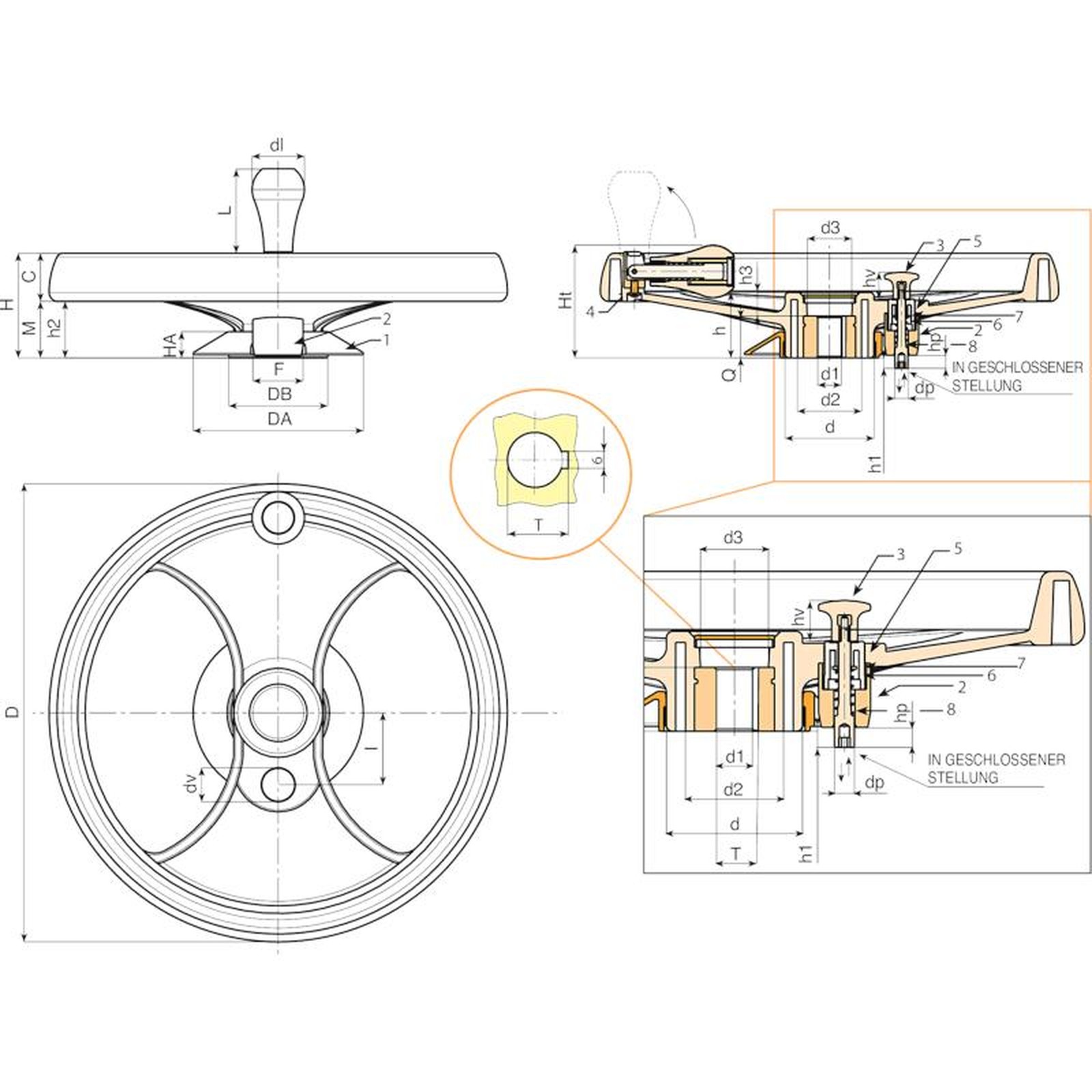 Umlegbarer Drehgriff im Handrad M202 “Euromodel” versenkbar, mit Sechskantanschluss. Griff aus PA6+GF schwarz RAL 9011. Umlegmechanismus aus brüniertem Stahl. Befestigung durch Zylinderschraube mit Innensechskant DIN 6912. Abdeckung des Griffs aus grauem Polyamid (RAL 7035 Code 13).