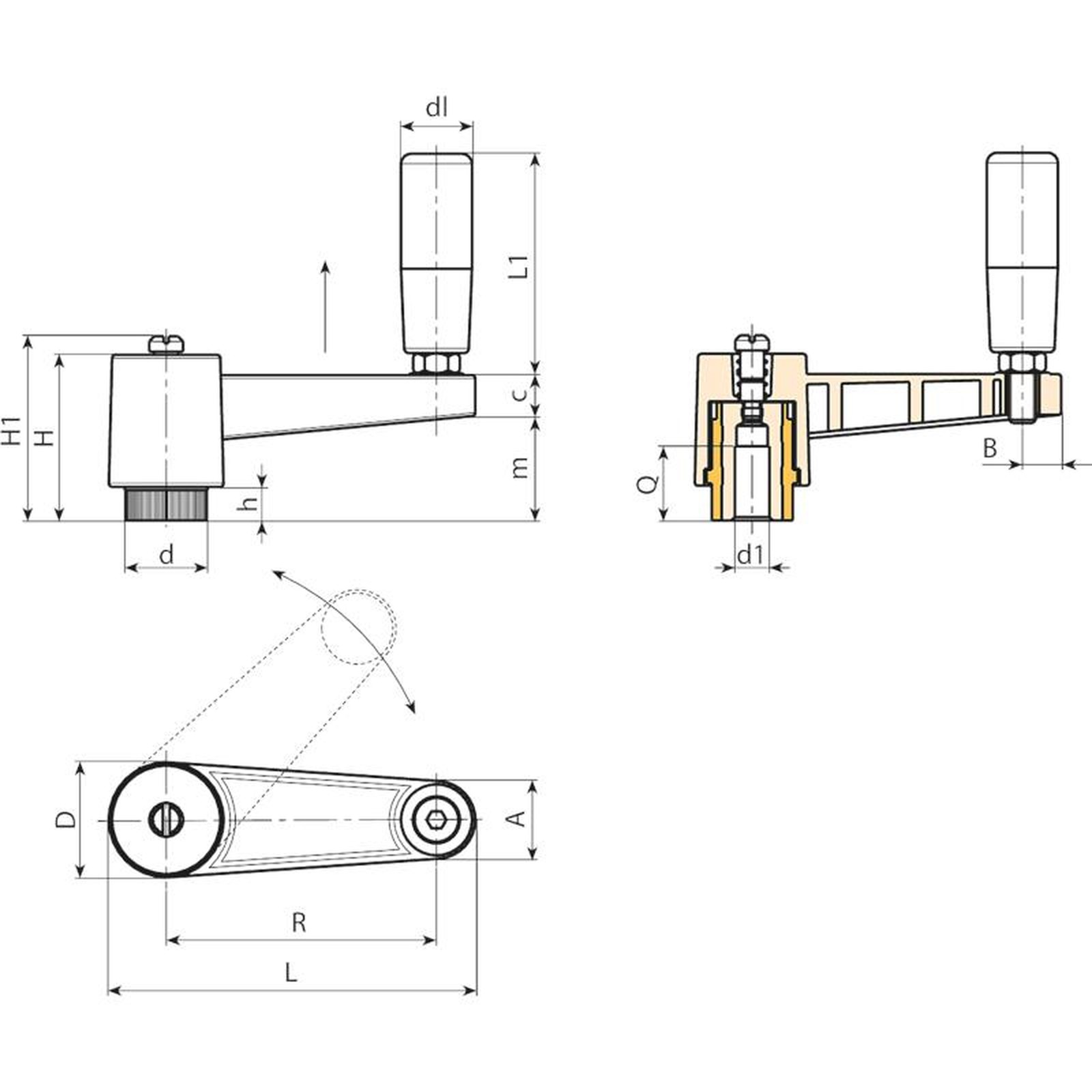 | Code | Art. | L | R | H | D | d | m | c | A | B | h | H1 | d1 H10 | Q | dl | L1 | Gewicht (g) |