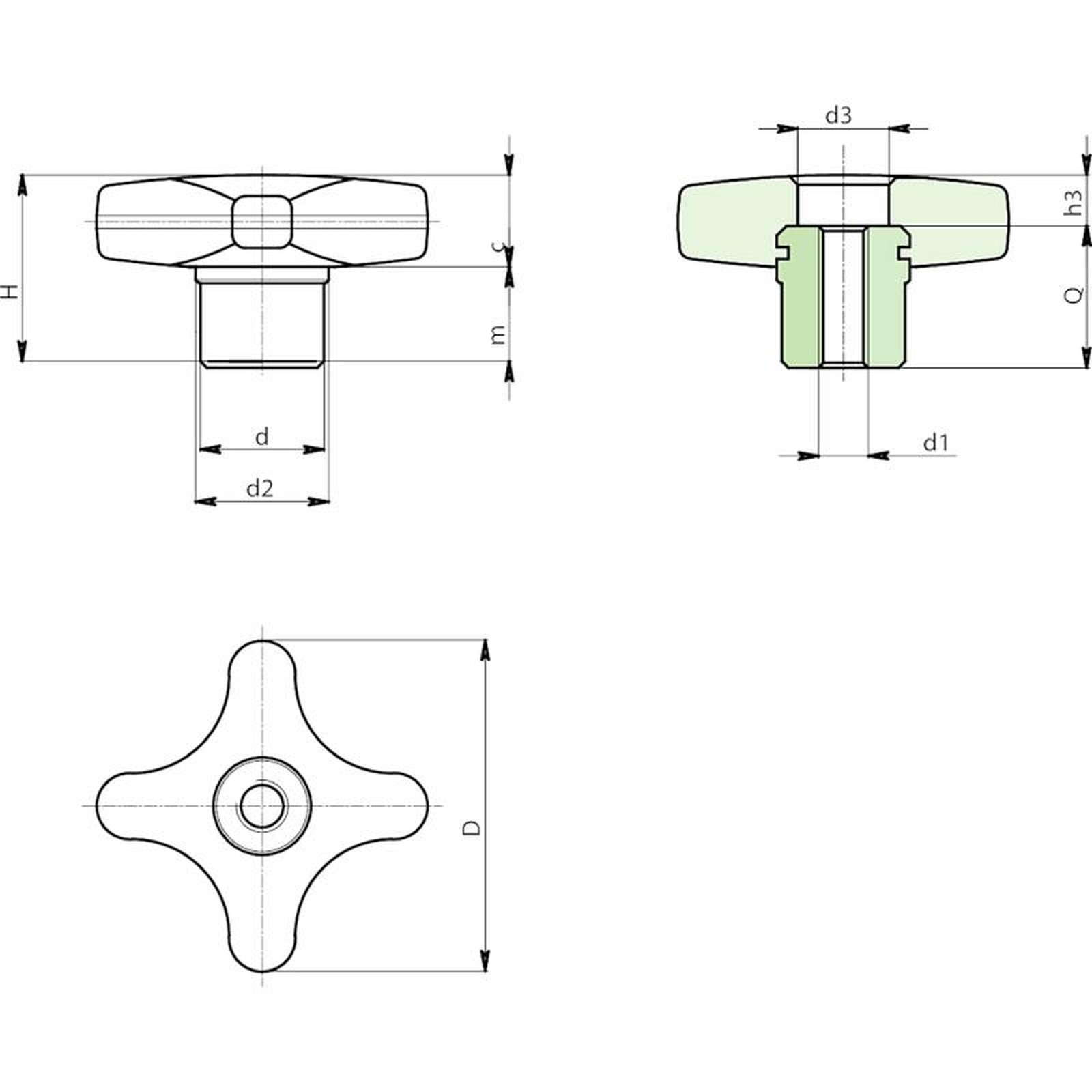 | Code | Art. | D | d | d2 | d3 | H | h3 | m | c | d1 6H | Q | Gewicht (g) |
