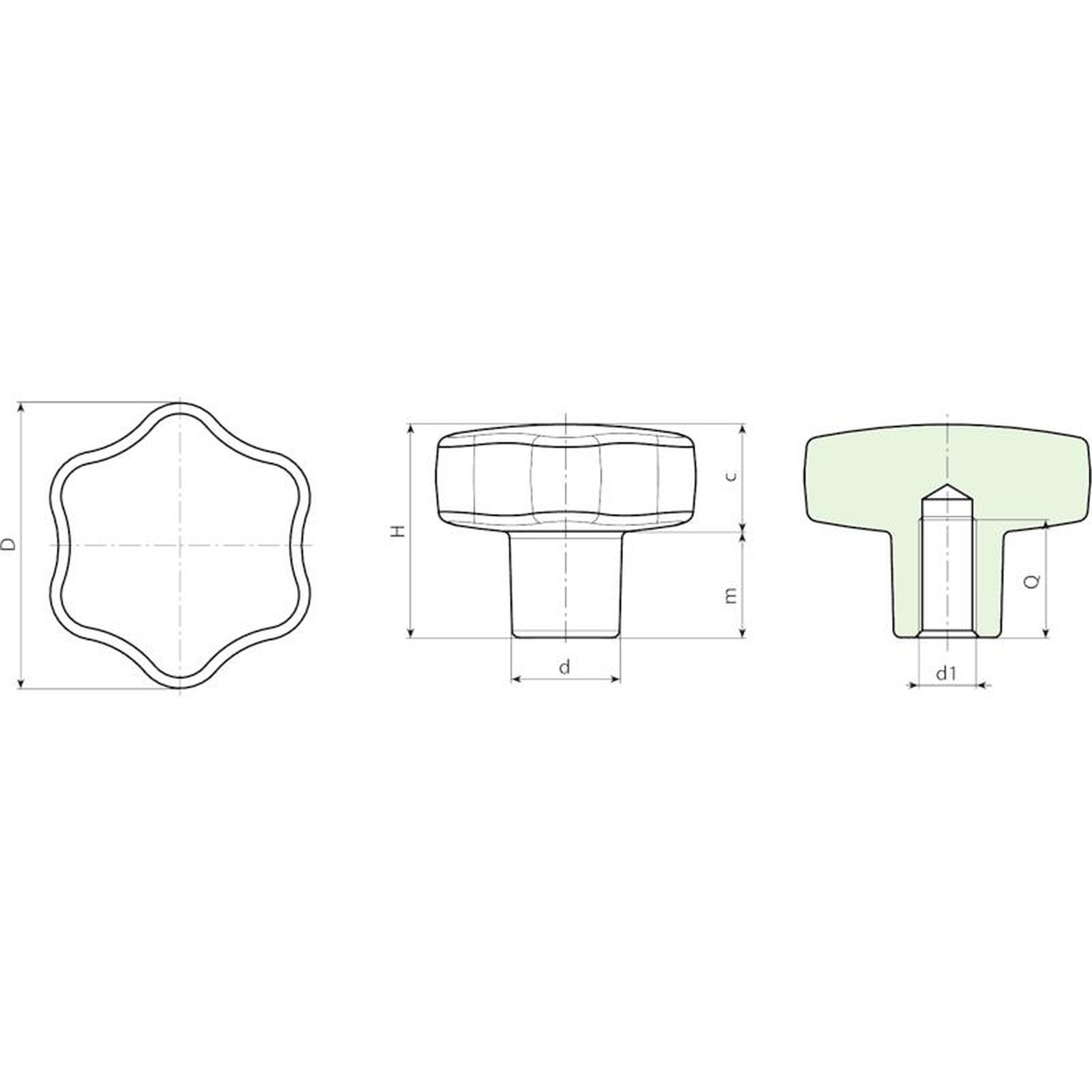 | Code | Art. | D | H | d | m | d1 6H | Q | Gewicht (g) |