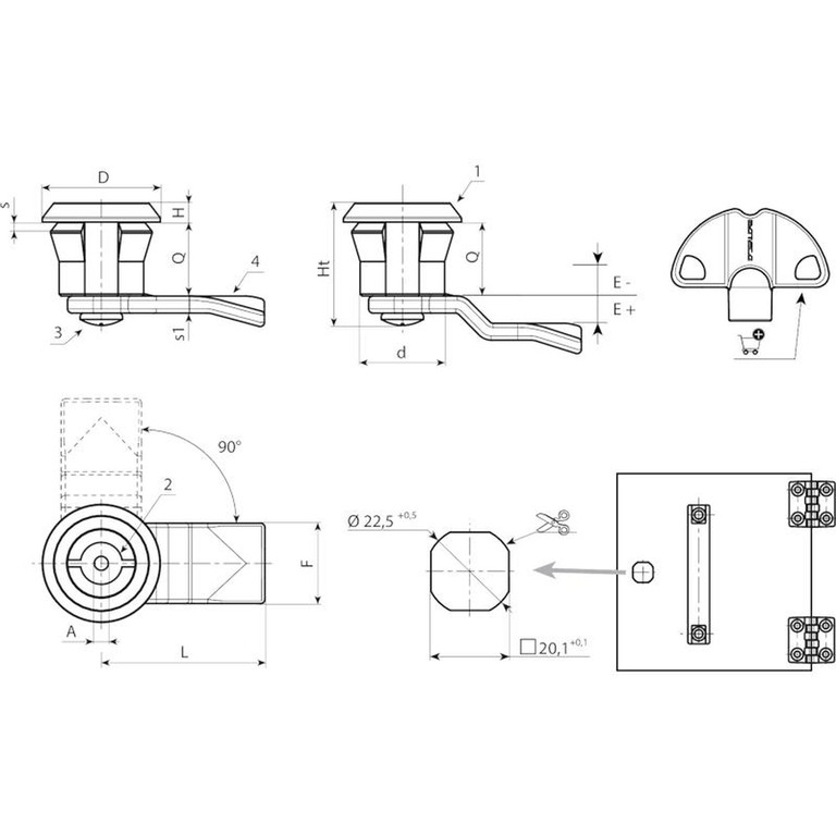| Code | Art. | A | d | D | L | Q | E | F | Ht | H | s (max.) | s1 | Gewicht (g) | Schlüssel |