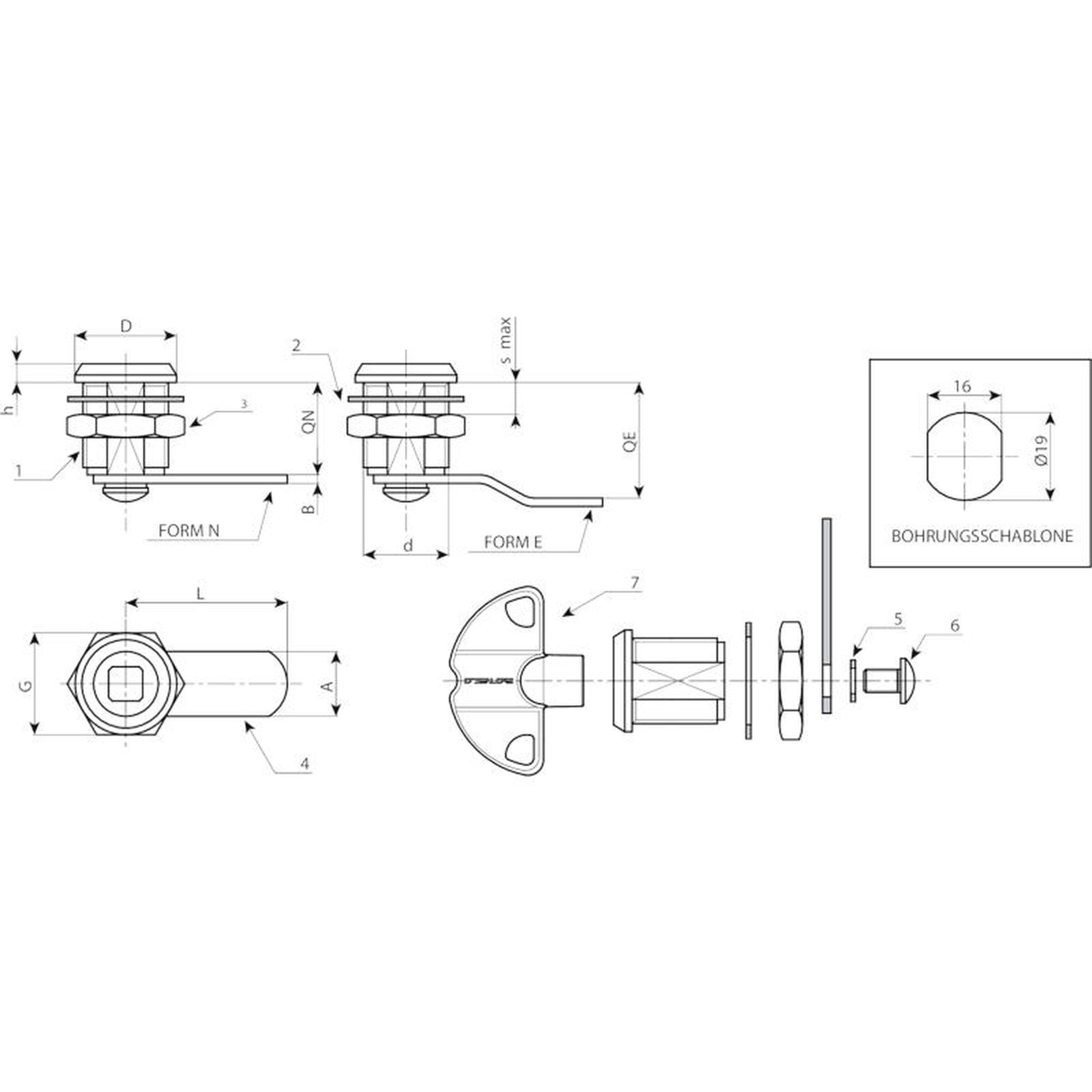 | Code | Art. | A | d | D | L | Q | E | F | G | Ht | H | s (max.) | s1 | Gewicht (g) | Schlüssel |