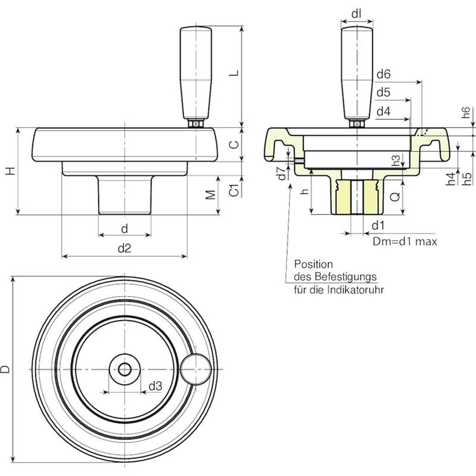 Geeignet für die Stellungsanzeiger der Baureihen K650 oder K660. Der Stellungsanzeiger kann nur in vertikaler Lage verwendet werden (horizontale Maschinenachse). Der Stellungsanzeiger und der zugehörige Gewindestift d7 sind separat zu bestellen. Weitere Informationen zu den Stellungsanzeigern siehe Seiten mit den Artikeln K650 und K660.