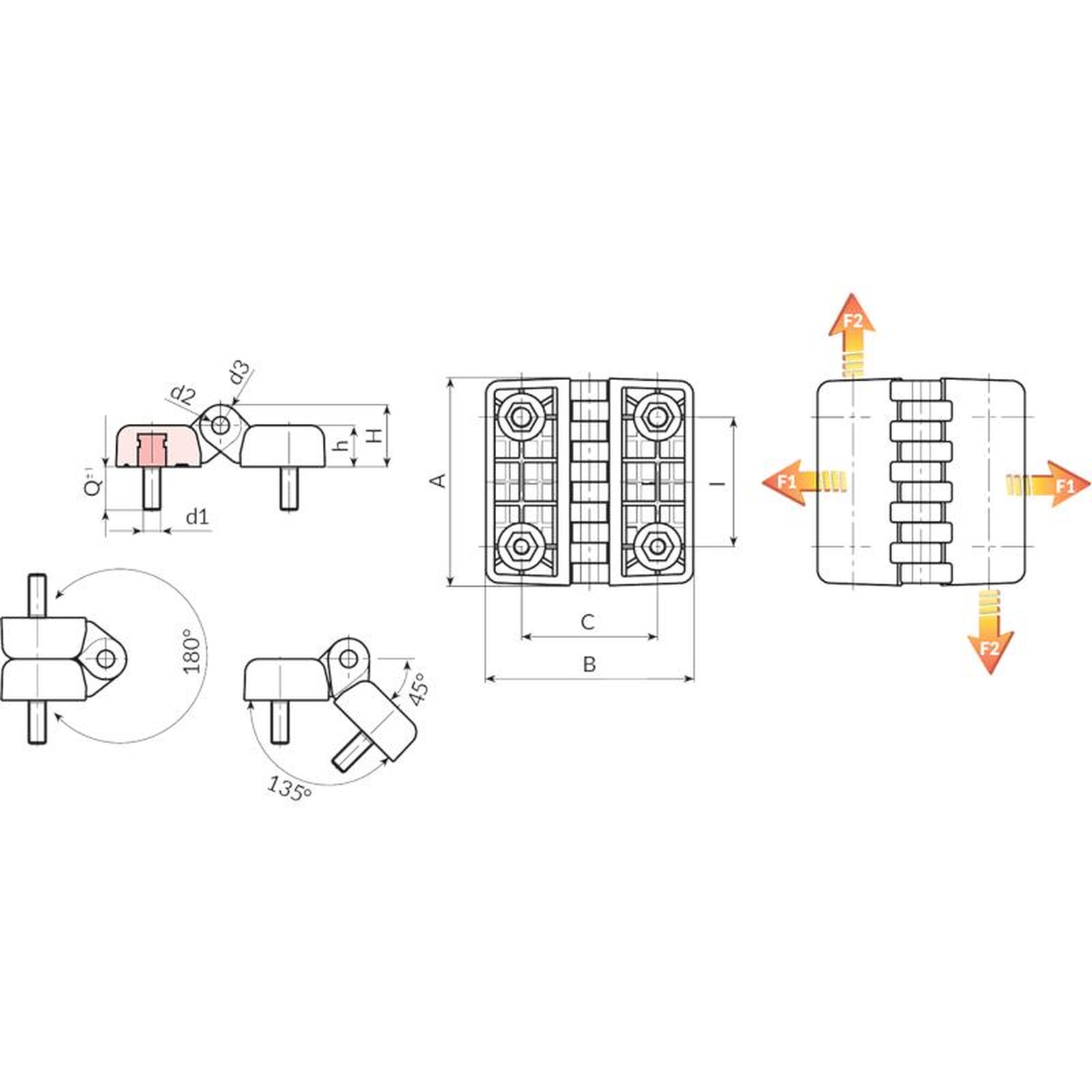 | Code | Art. | I | C | A | B | h | H | d2 | d3 | d1 6g | Q | Gewicht (g) | F1 (N) | F2 (N) |