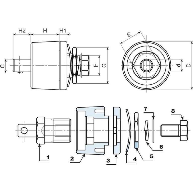 | Code | Art. | D | H | H1 | H2 | d | c | E | F | G | Gewicht (g) | Amp. Max |