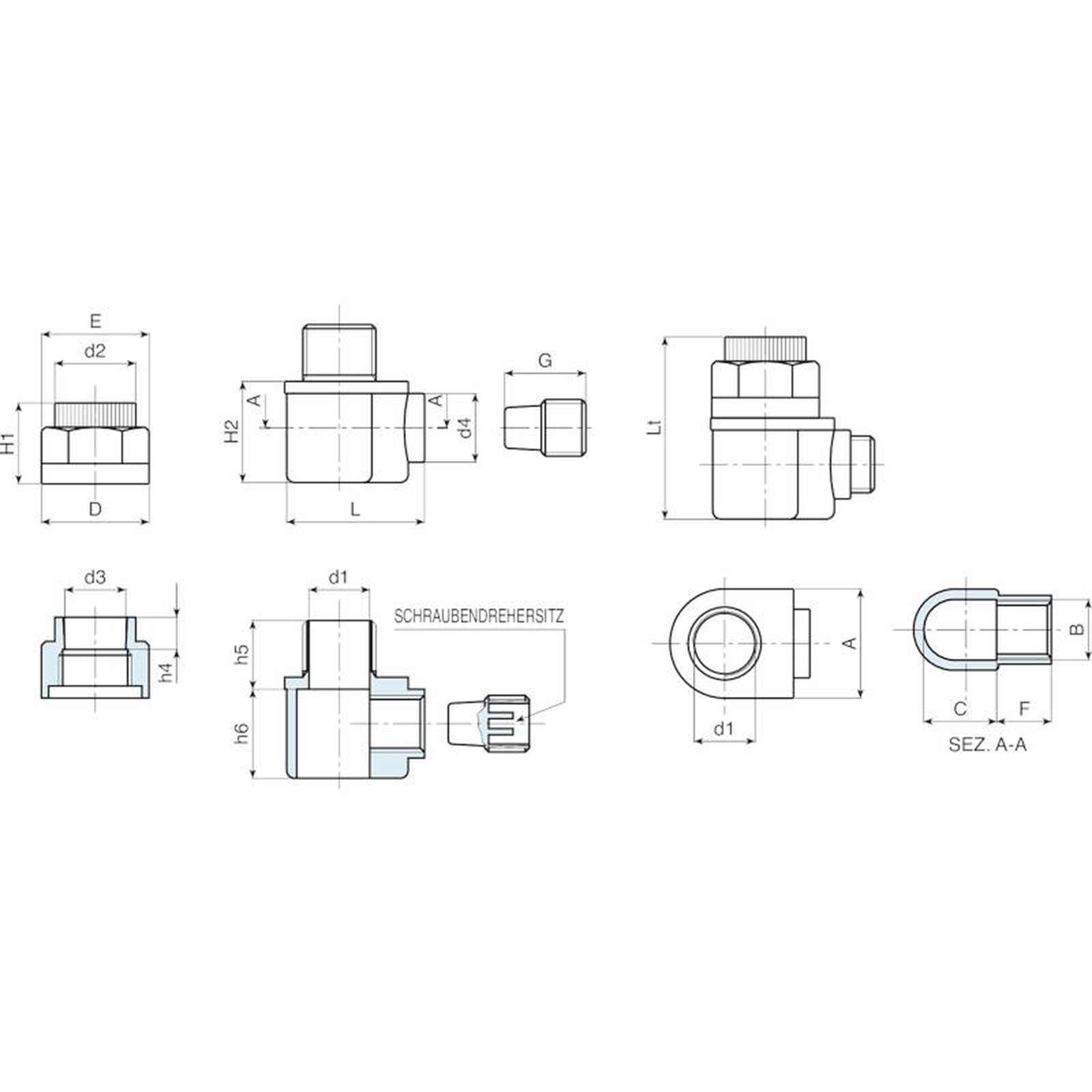 | Code | Art. | B | C | D | E | F | G | L | H1 | H2 | h4 | h5 | h6 | d1 | d2 | d3 | d4 | Lt | Gewicht (g) |