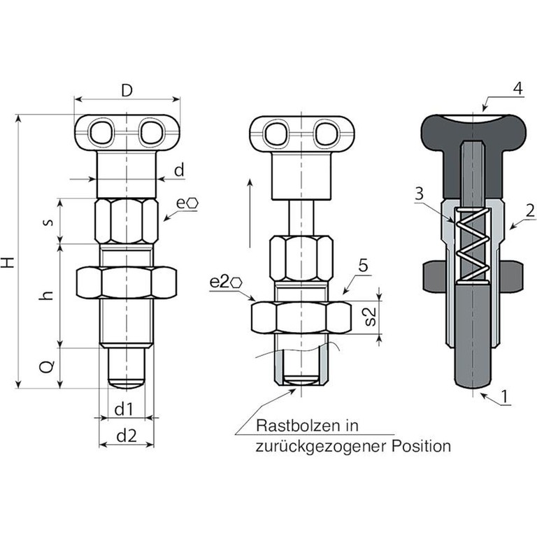 (2) Rastbolzenkorpus aus Edelstahl (AISI 303).