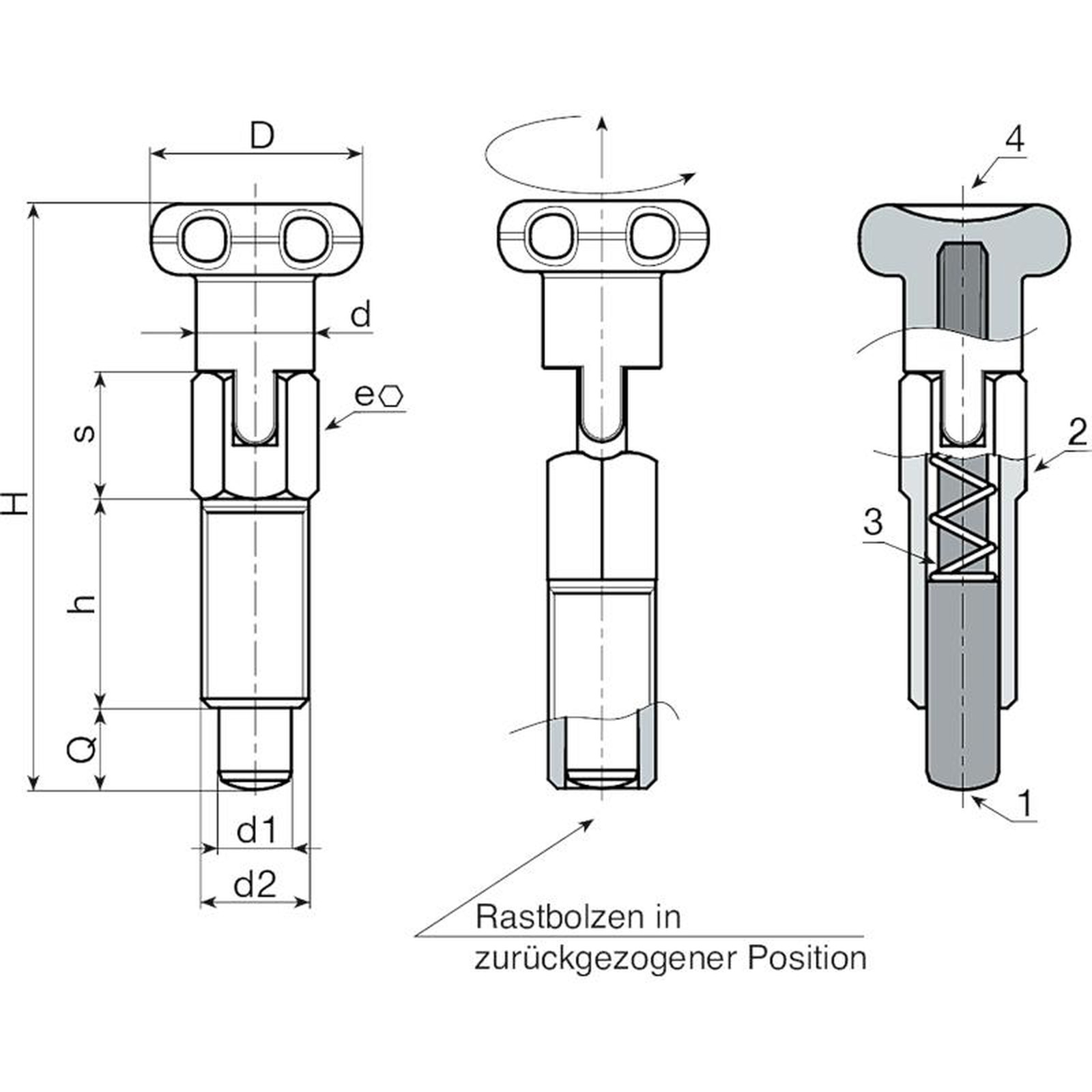 (2) Rastbolzenkorpus mit Sperre, aus Edelstahl (AISI 303).