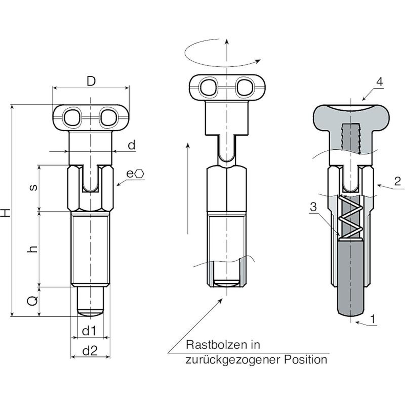 (2) Rastbolzenkorpus mit Sperre, aus Edelstahl (AISI 303).