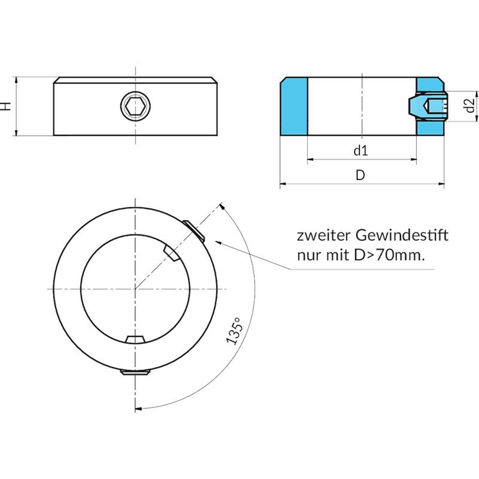 Der zweite Gewindestift wird ab dem Durchmesser D=>70 mm hinzugefügt.