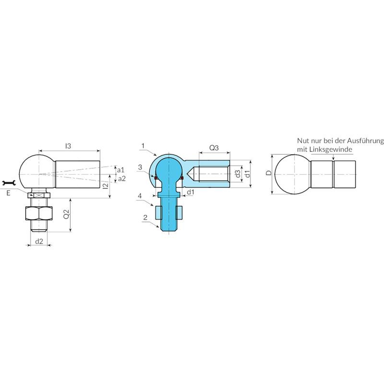 Linksgewinde (Gewindetoleranz 6H). Unterscheidbar durch die Nut auf dem Gelenk.