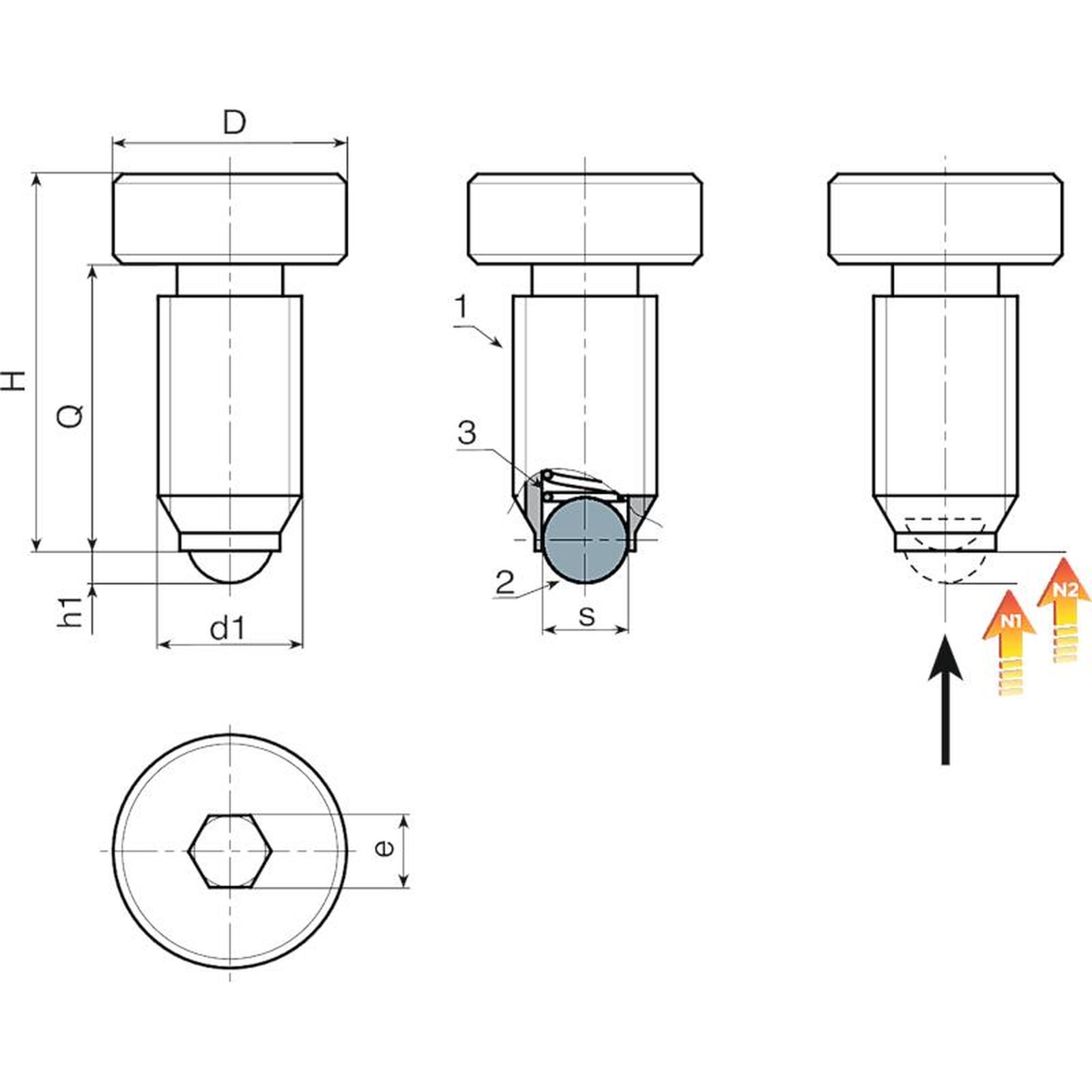 | Code | art. | D (+0 -0.2) | H | h1 | e | s | N1 (N) | N2 (N) | d1 6g | Q | Weight (g) |