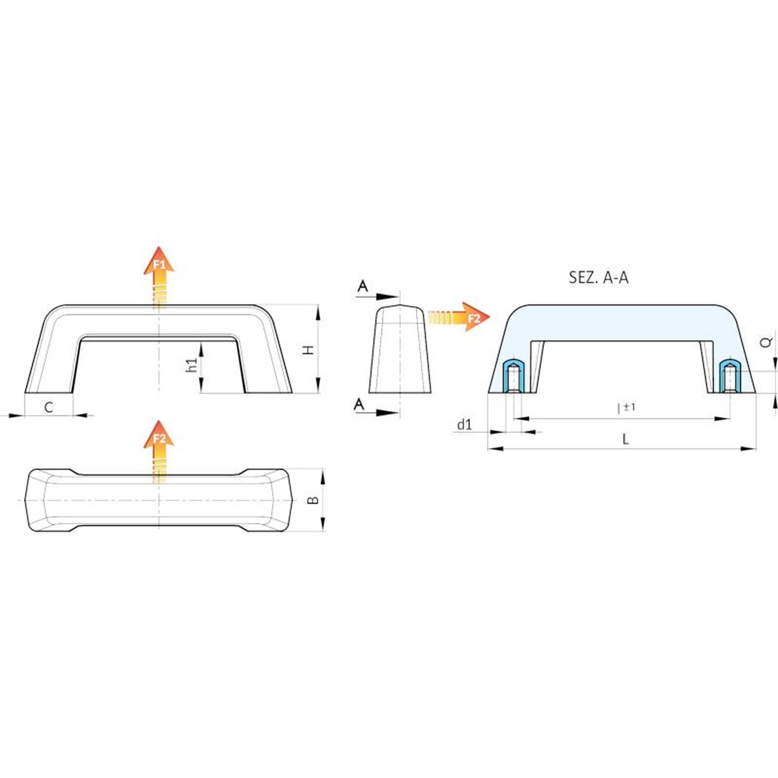 | Code | art. | L | I | B | H | h1 | C | d1 6H | Q | Weight (g) | F1 (N) | F2 (N) |