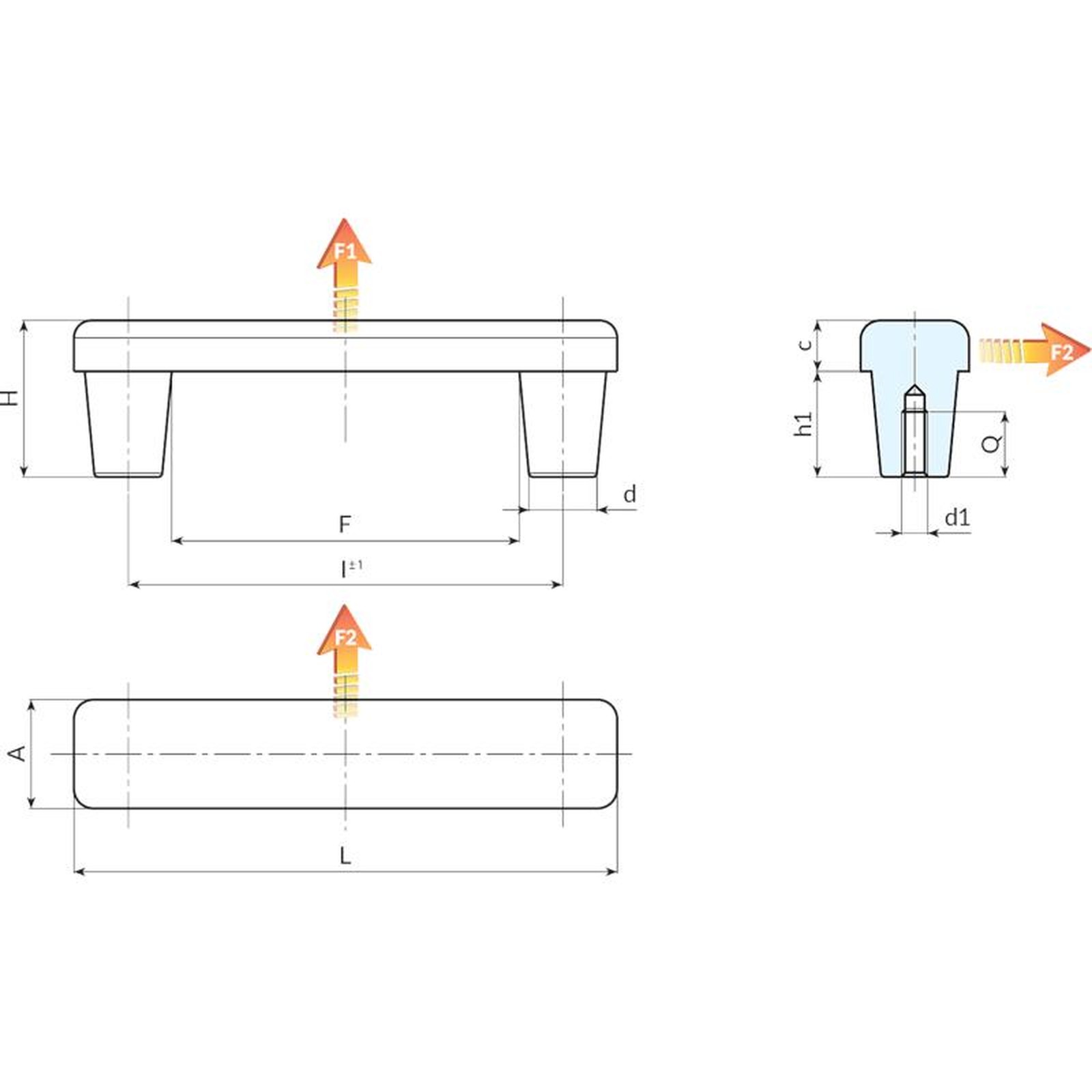 | Code | art. | L | I ±1 | F | A | H | h1 | c | d | d1 | Q | Weight (g) | F1 (N) | F2 (N) |