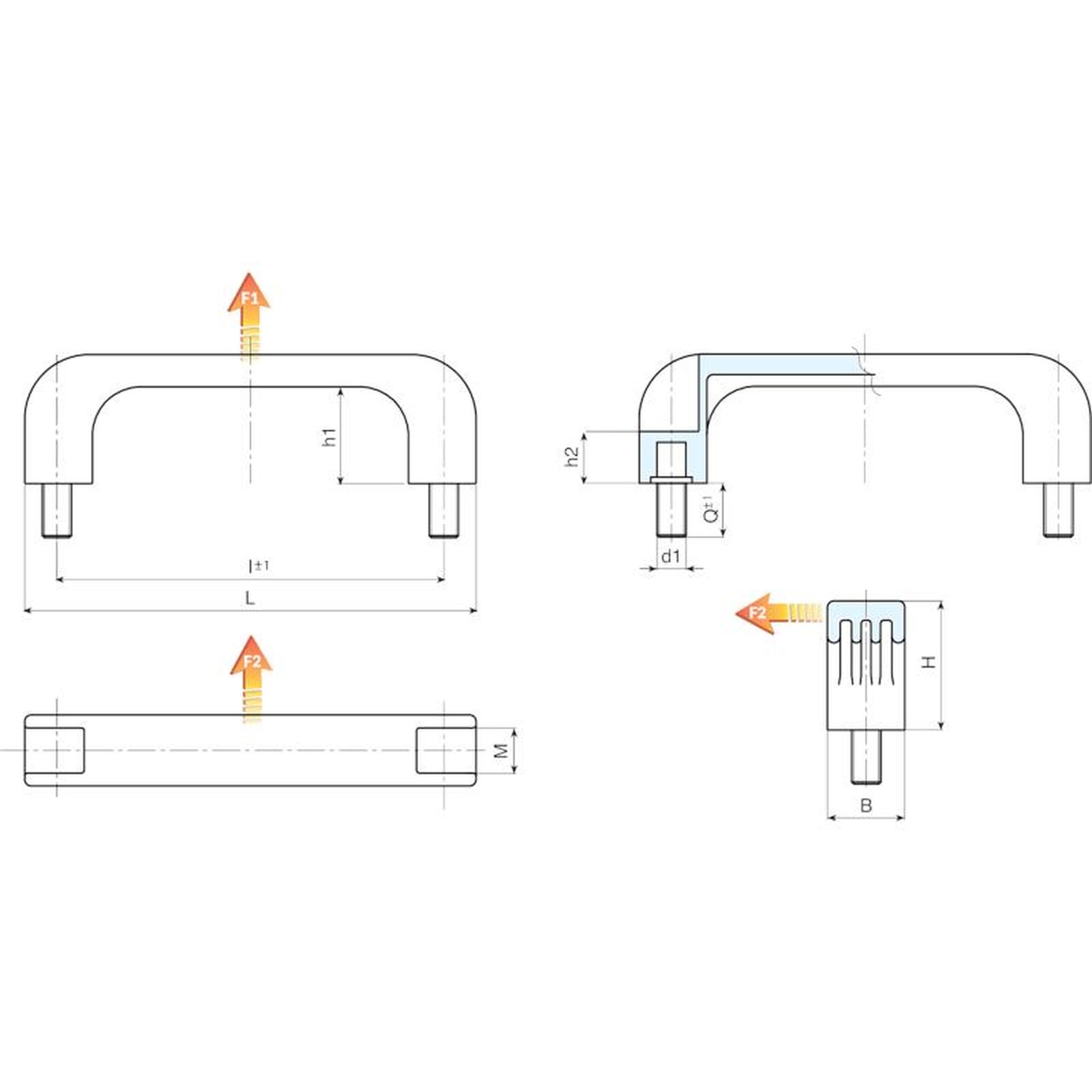 | Code | art. | L | I ±1 | B | M | H | h1 | h2 | Q | d1 6g | Weight (g) | F1 (N) | F2 (N) |
