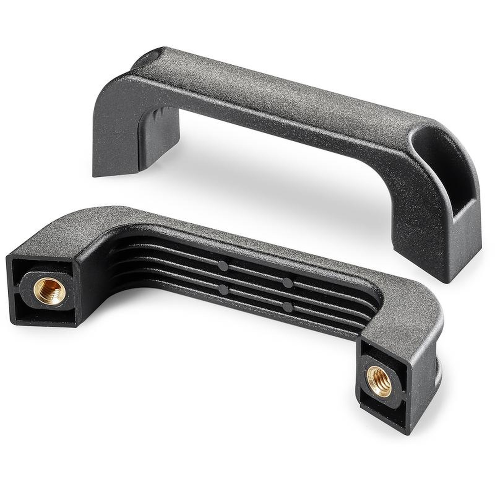 This handle is designed for use on round surfaces. The drawing shows the diameter of the surface for which the handle is designed. The handle can also be flexed slightly to best fit the existing holes, or to compensate for small variations in hole diameter or centre distance. One example of this handle's use is on industrial drum top vacuums.
