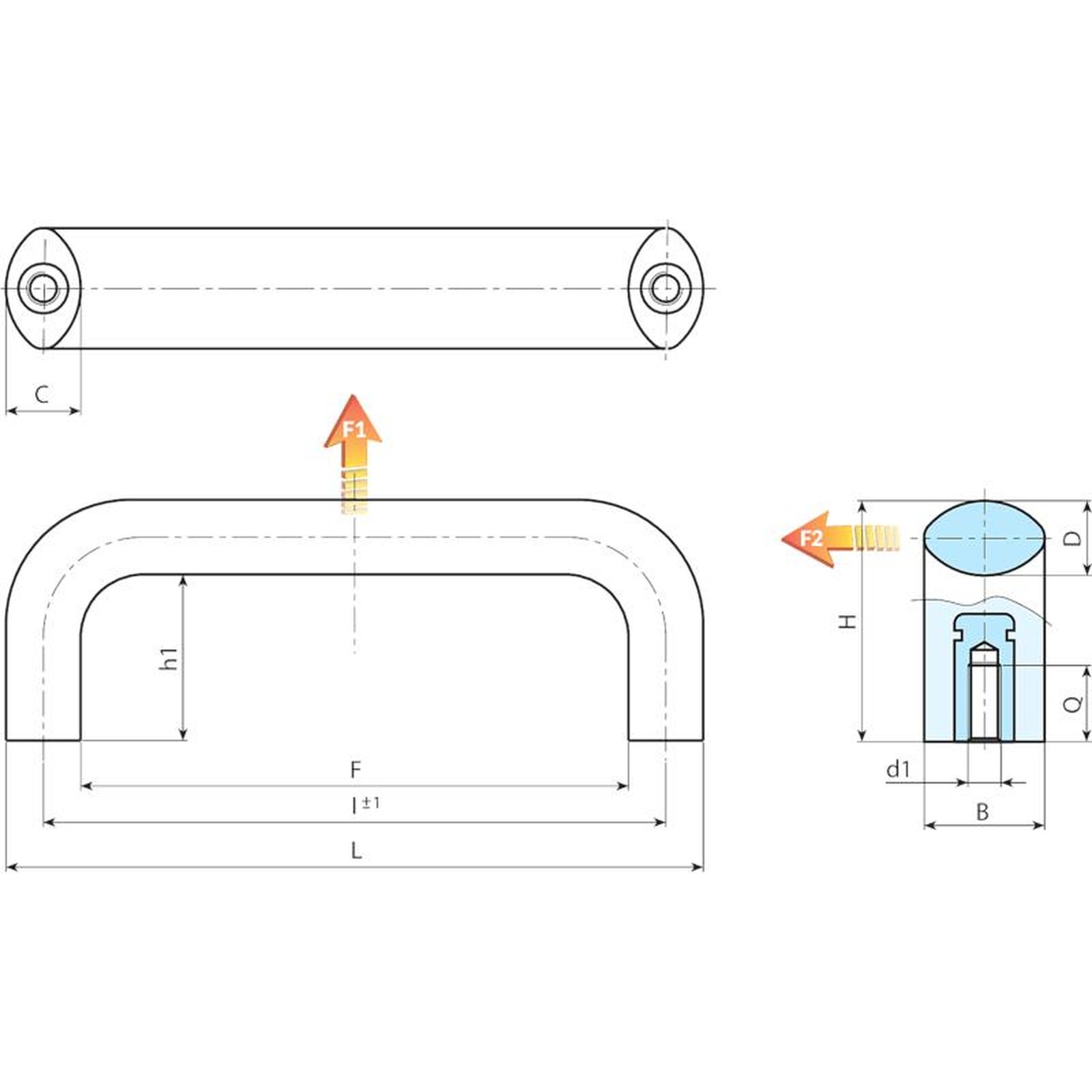 | Code | art. | L | I ±1 | F | B | C | D | H | h1 | Q | d1 6H | Weight (g) | F1 (N) | F2 (N) |