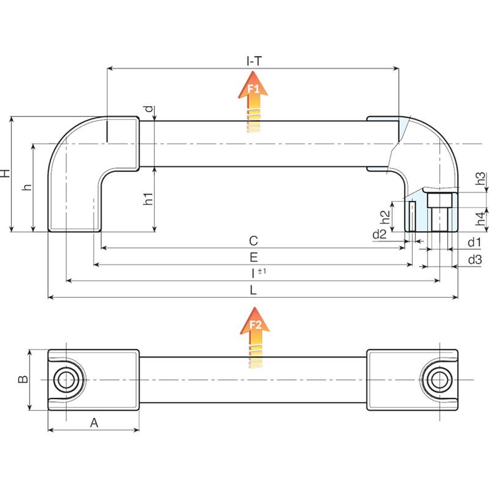 | Code | art. | L | I ±1 | C | E | A | B | T | H | h | h1 | h4 | h3 | h2 | d | d3 | d2 | d1 | Weight (g) | F1 (kN) | F2 (kN) |