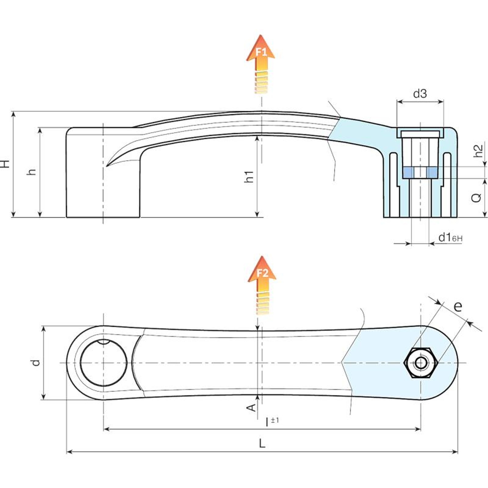 | Code | art. | L | I ±1 | H | h | h1 | h2 | A | d | d3 | e | Q | d1 6H | Weight (g) | F1 (N) | F2 (N) |