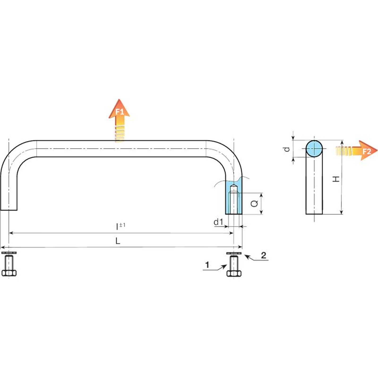 | Code | art. | L | I ±1 | H | d | Q | d1 | Weight (g) | F1 (N) | F2 (N) |