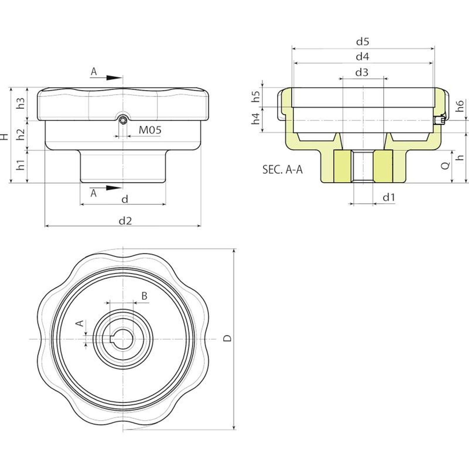 | Code | art. | D | H | h | h1 | h2 | h3 | h4 | h5 | h6 | d | d2 | d3 | d4 | d5 | A | B | d1 H10 | Q | Weight (g) |