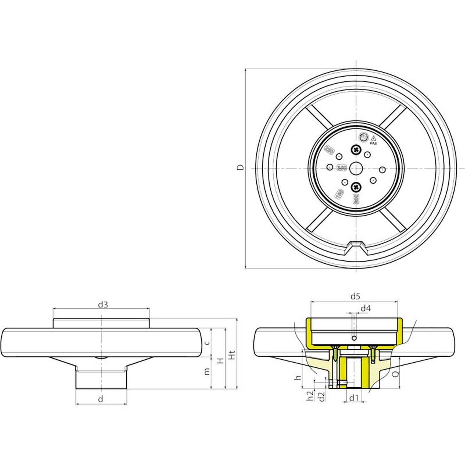 | Code | art. | D | d | m | c | H | Ht | h | h2 | d2 | d3 | d4 | d5 ±0,5 | Dm | d1 H10 | Q | Weight (g) |