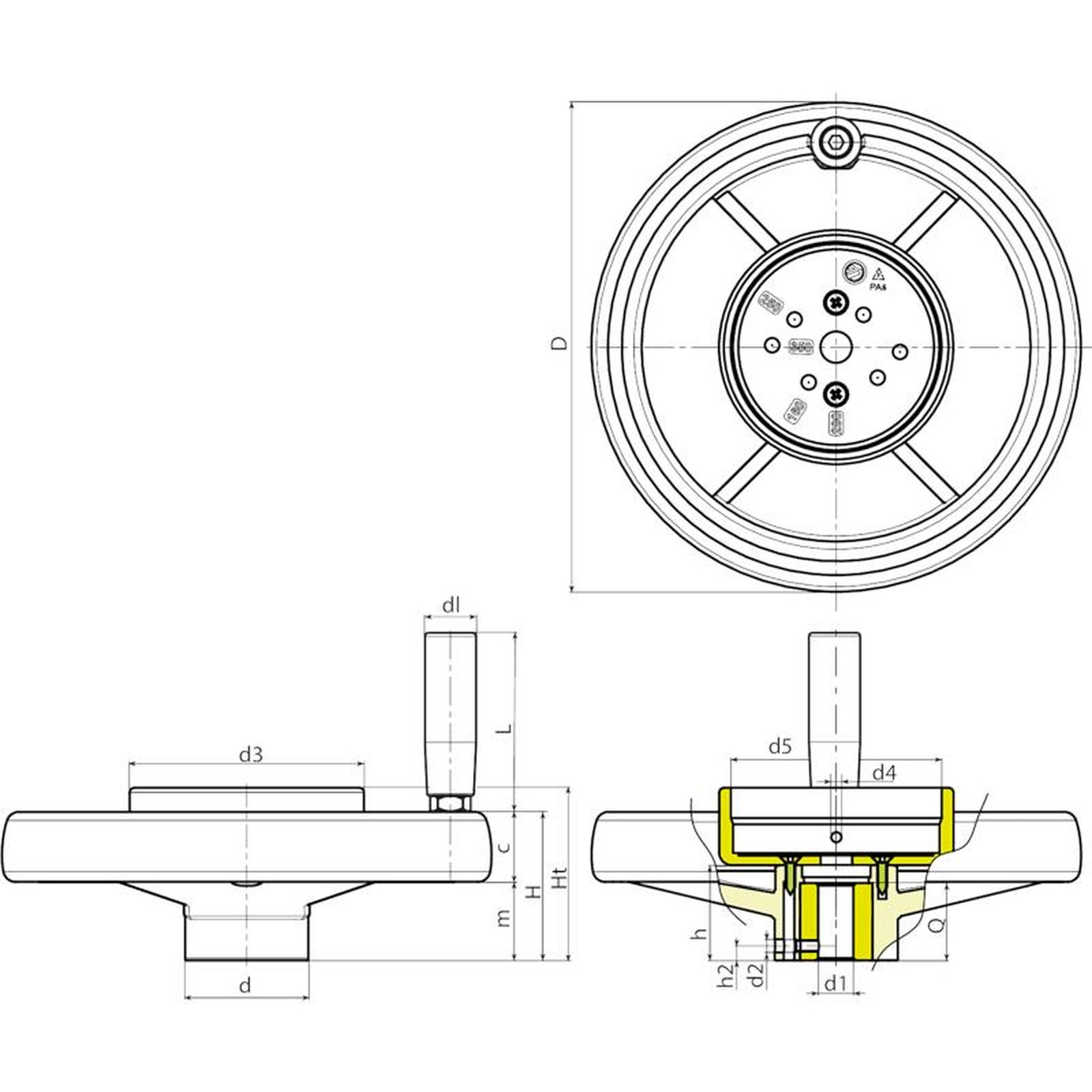 | Code | art. | D | d | m | c | H | Ht | h | h2 | d2 | d3 | d4 | d5 ±0,5 | Dm | d1 H10 | dl | L | Q | Weight (g) |