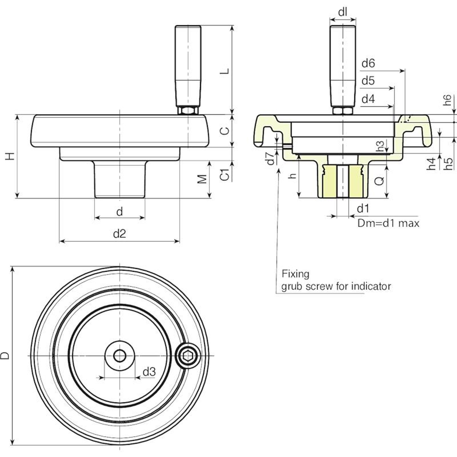 | Code | art. | D | H | d | d2 | M | C | C1 | d3 | d4 | d5 | d6 | d7 | h | h3 | h4 | h5 | h6 | dl | L | Dm | d1 | Q | Weight (g) |