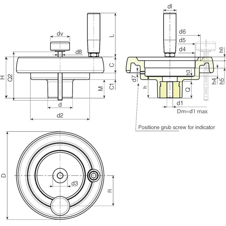 | Code | art. | D | H | d | d2 | M | C | C1 | d3 | d4 | d5 | d6 | d7 | h | h3 | h4 | h5 | h6 | R | d8 | dl | L | Dm | d1 | Q | Weight (g) |