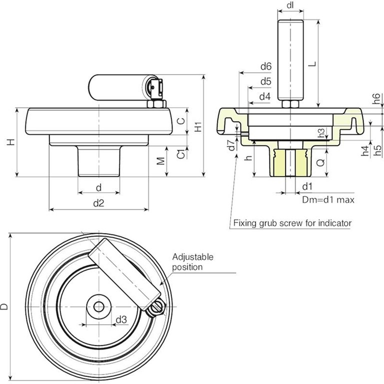 | Code | art. | D | H | H1 | d | d2 | M | C | C1 | d3 | d4 | d5 | d6 | d7 | h | h3 | h4 | h5 | h6 | dl | L | Dm | d1 | Q | Weight (g) |