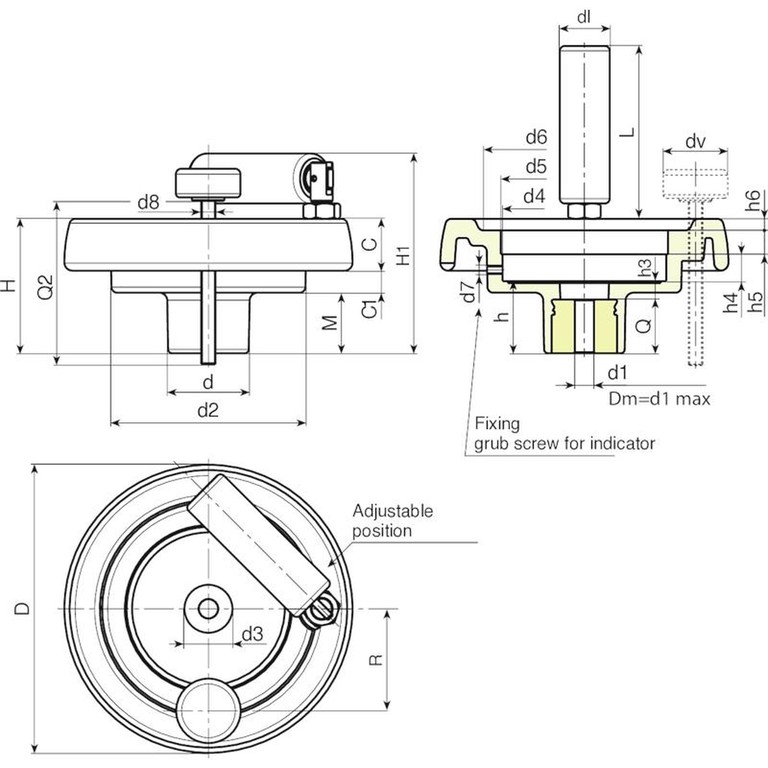 | Code | art. | D | H | H1 | d | d2 | M | C | C1 | d3 | d4 | d5 | d6 | d7 | h | h3 | h4 | h5 | h6 | R | d8 | dl | L | Dm | d1 | Q | Weight (g) |