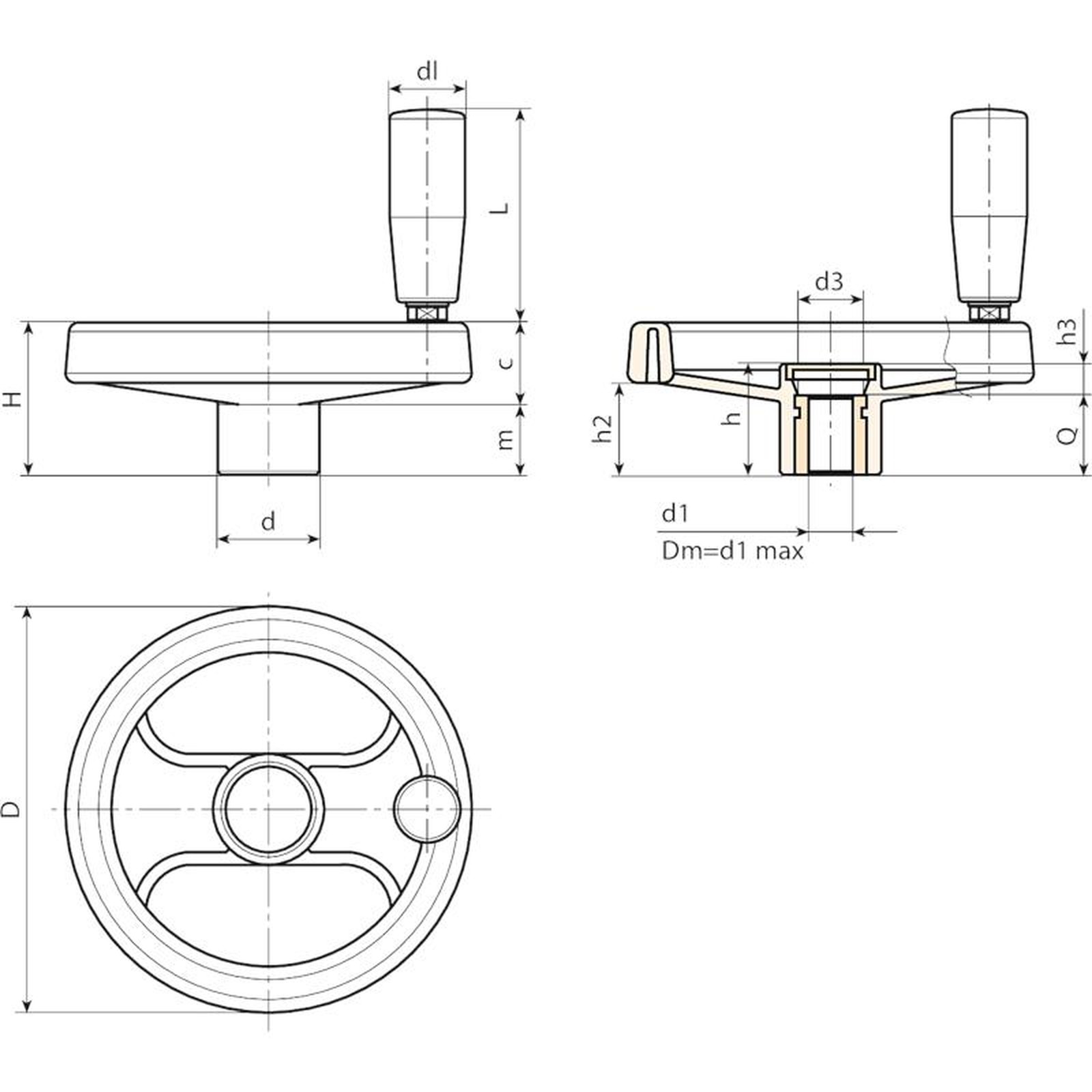 | Code | Art. | D | H | h | d | m | c | h2 | h3 | d3 | dl | L | Dm | d1 H10 | Q | Weight (g) |
