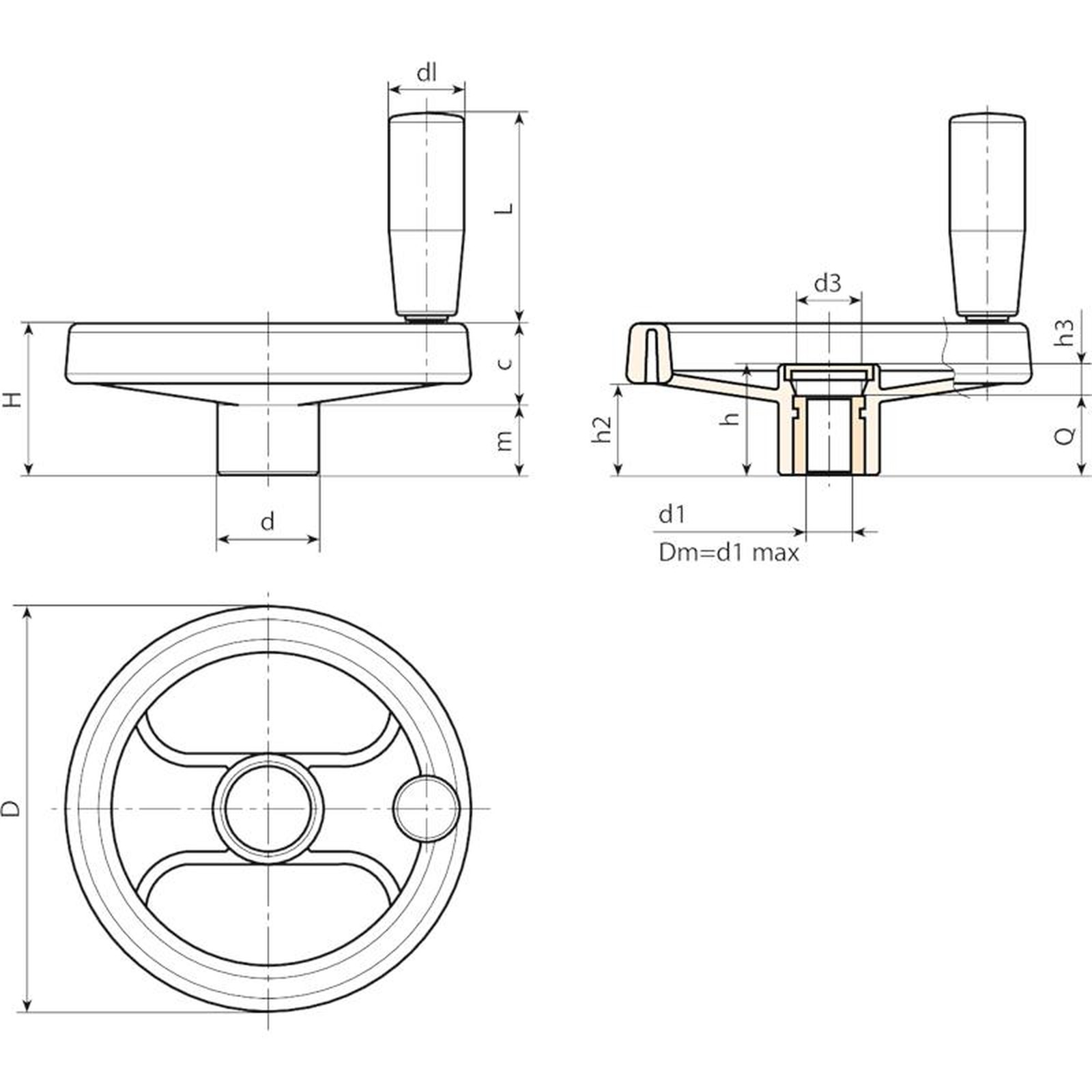 | Code | Art. | D | H | h | d | m | c | h2 | h3 | d3 | dl | L | Dm | d1 H10 | Q | Weight (g) |