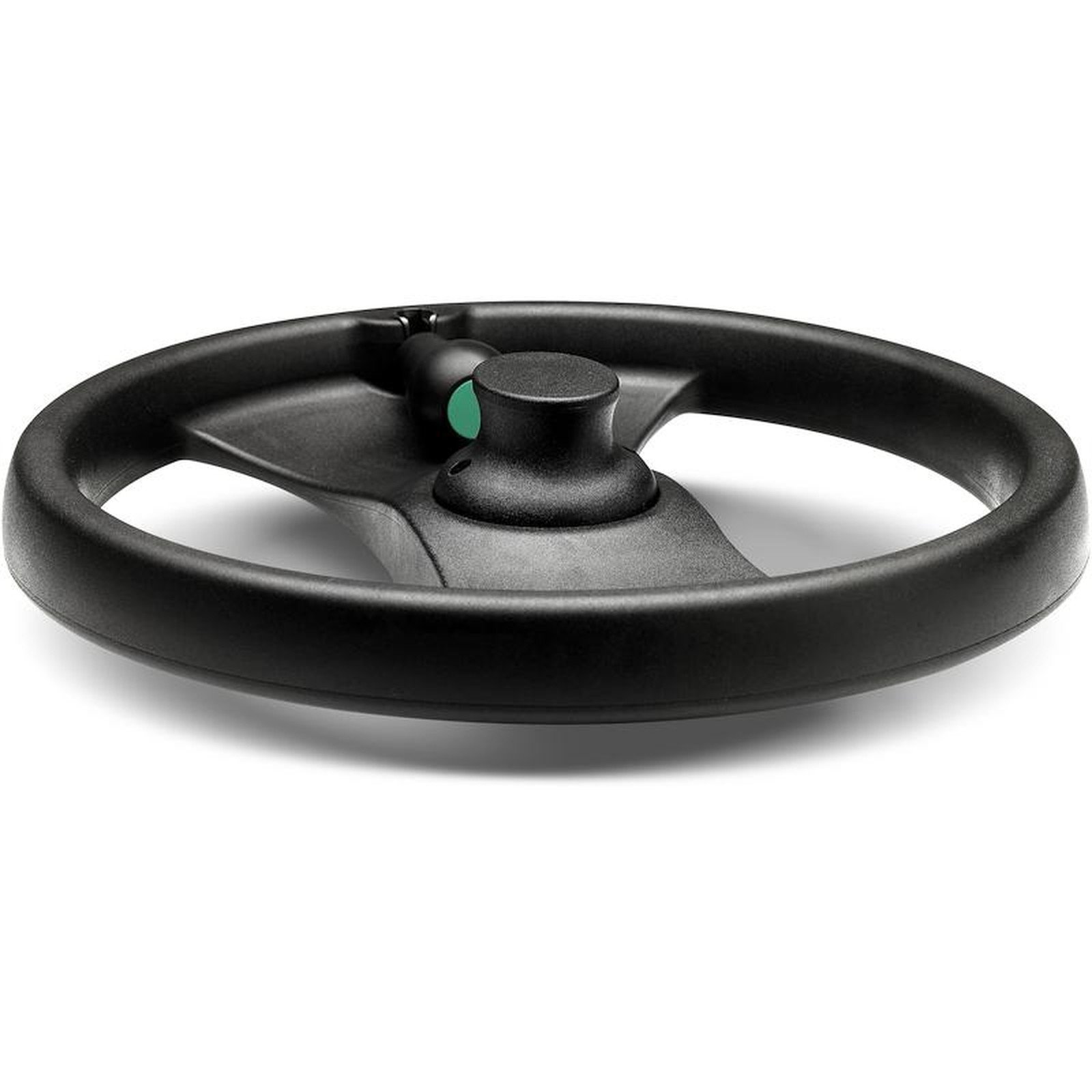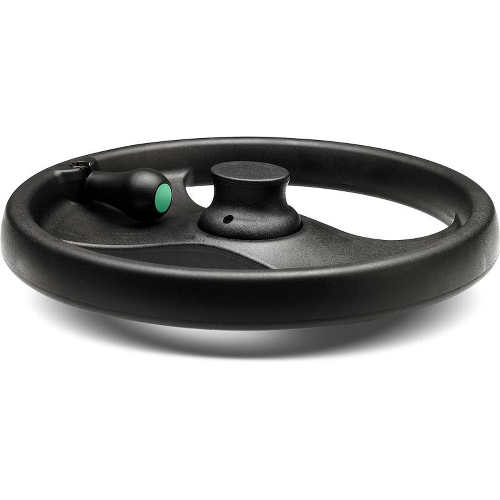 Flush, foldaway revolving handle in handwheel M202 “Euromodel”, with hexagonal connection. PA6+GF handle, black RAL 9011. Black-oxide treated internal mechanism. Fixed with black-oxide treated hexagon socket button head screw ISO 7838. Handle cap in green polyamide (RAL 6023 code 17).