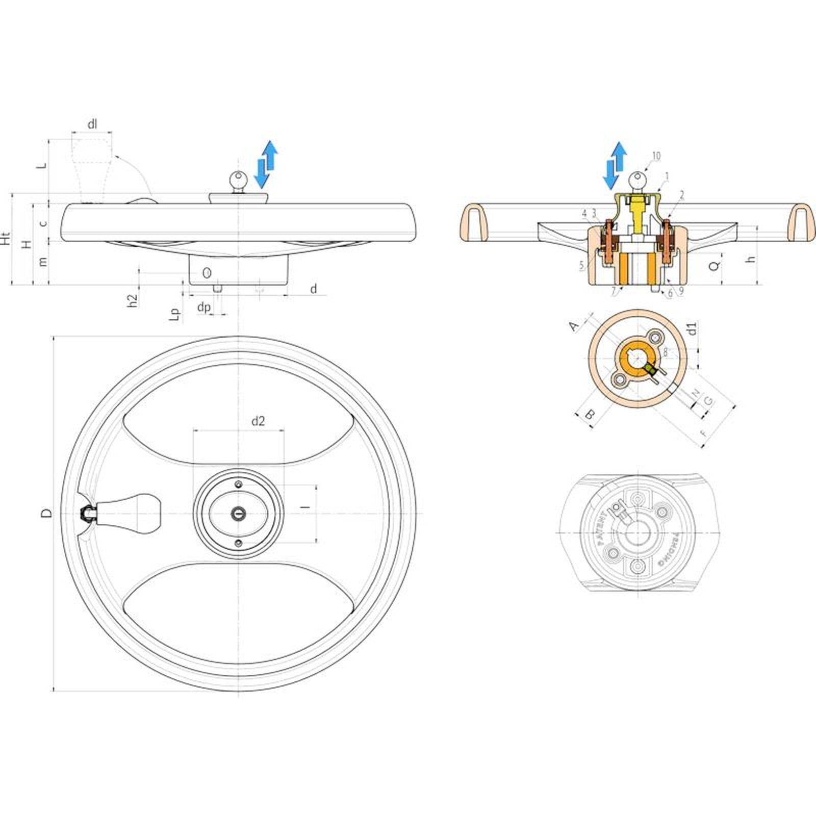 EUROMODEL SPOKE HANDWHEEL WITH REVOLVING AND FOLDING HANDLE WITH CENTRAL LOCKING KNOB AND LOCK