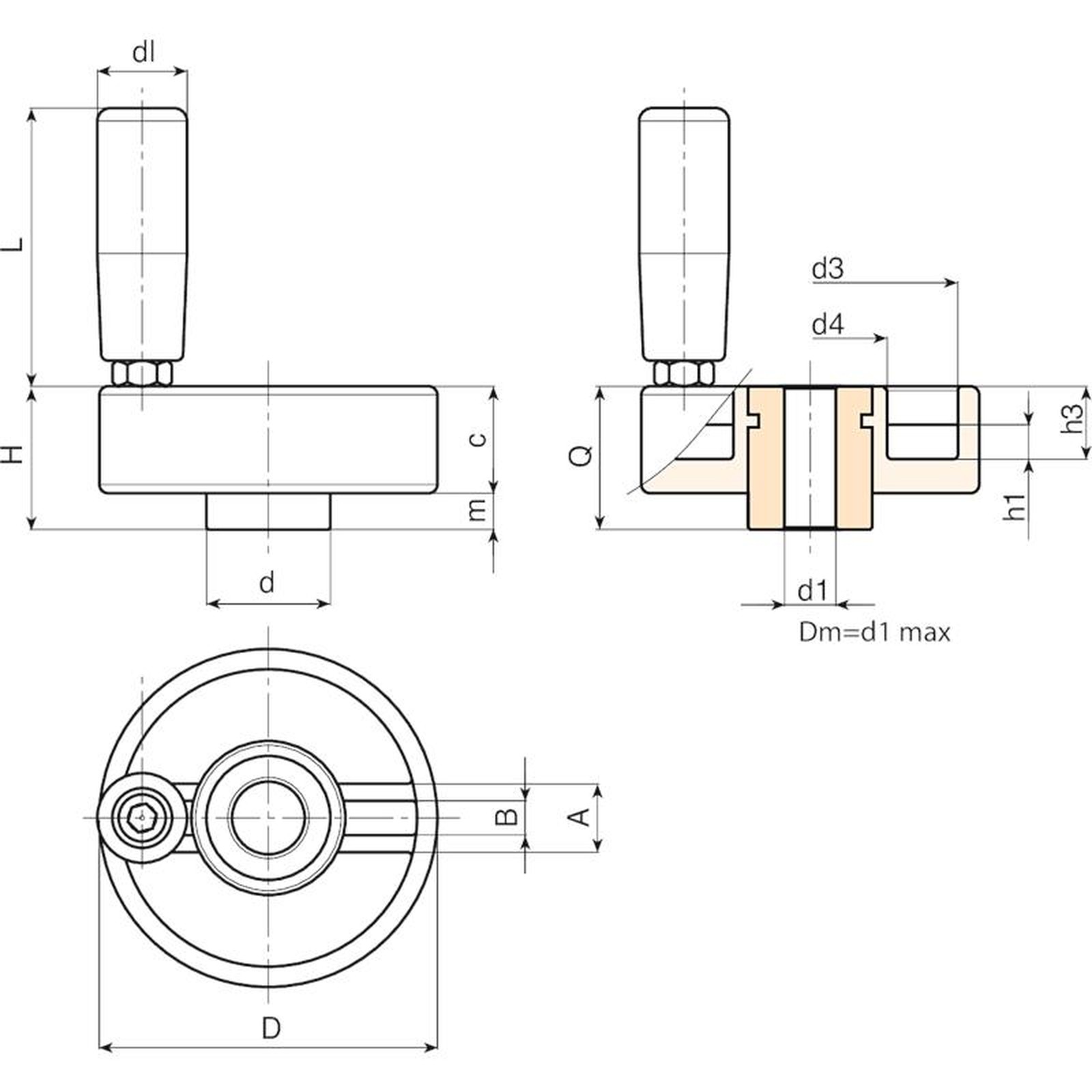 | Code | Art. | D | H | d | c | m | h1 | h3 | A | B | d3 | d4 | dl | L | Dm | d1 H10 | Q | Weight (g) |