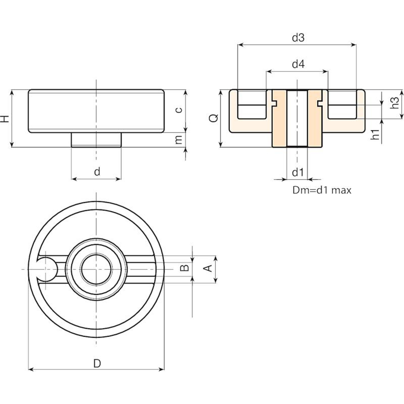 | Code | Art. | D | H | d | c | m | h1 | h3 | A | B | d3 | d4 | Dm | d1 H10 | Q | Weight (g) |