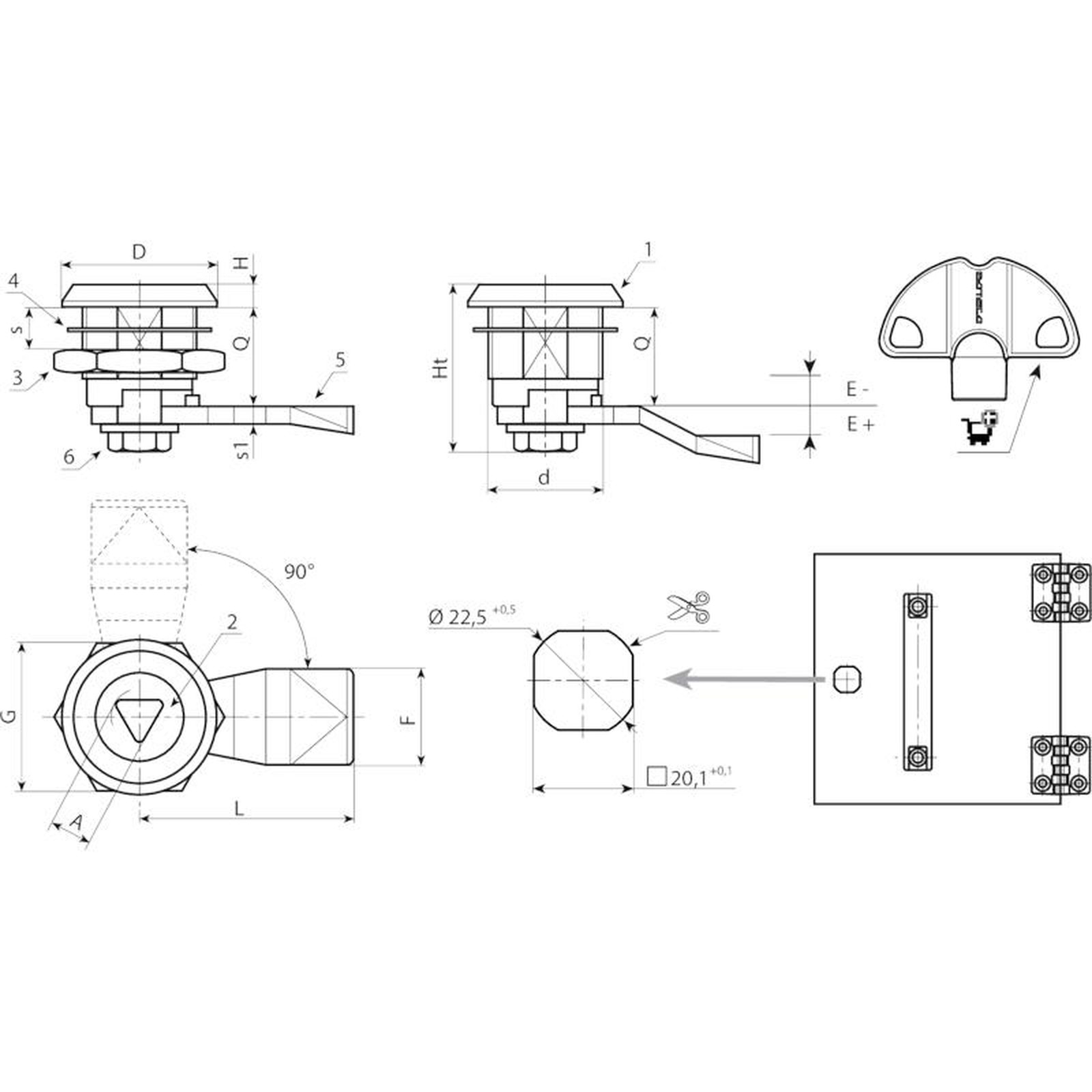 | Code | Art. | A | d | D | L | Q | E | F | G | Ht | H | s (max.) | s1 | Weight (g) | Key |
