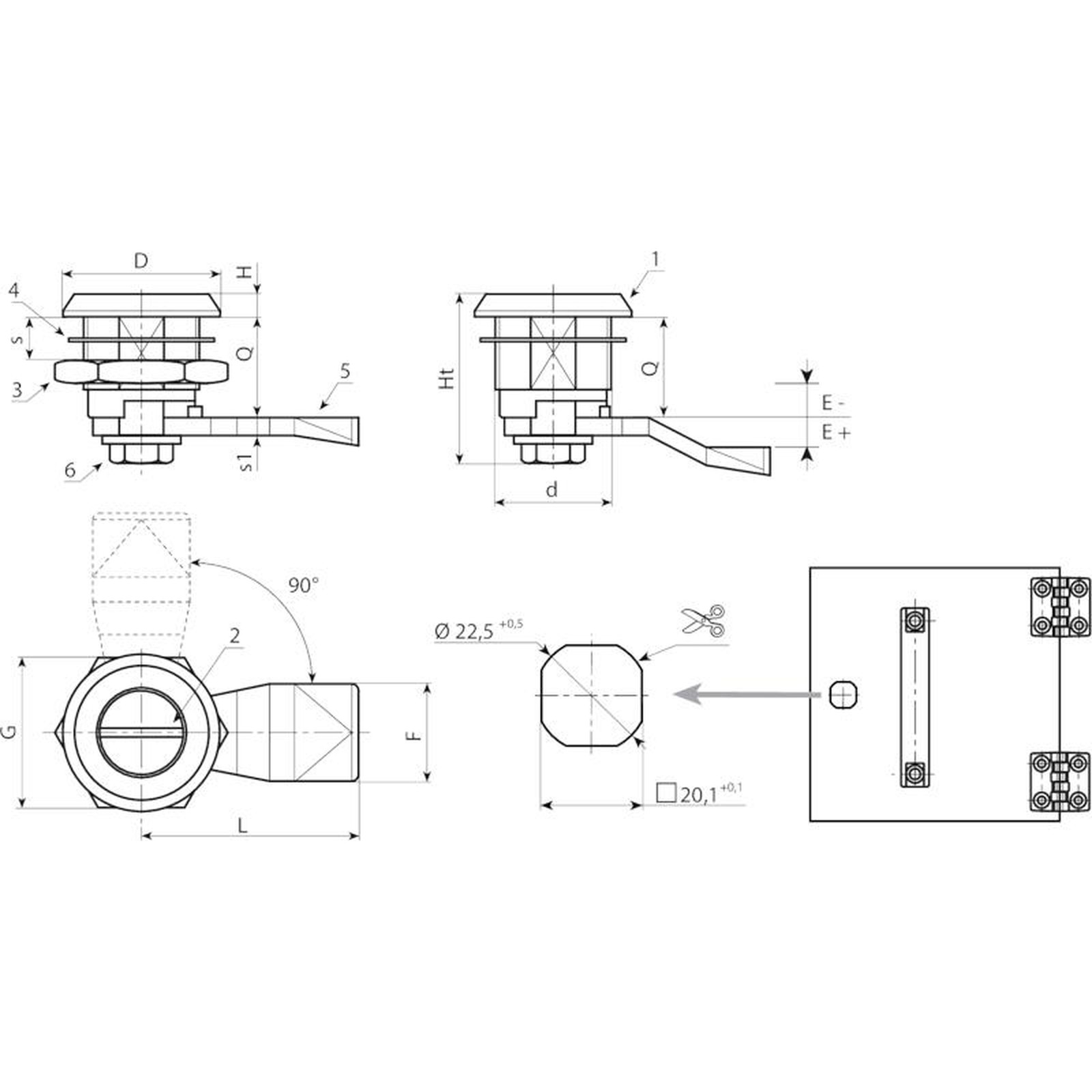| Code | Art. | d | D | L | Q | E | F | G | Ht | H | s (max.) | s1 | Weight (g) |